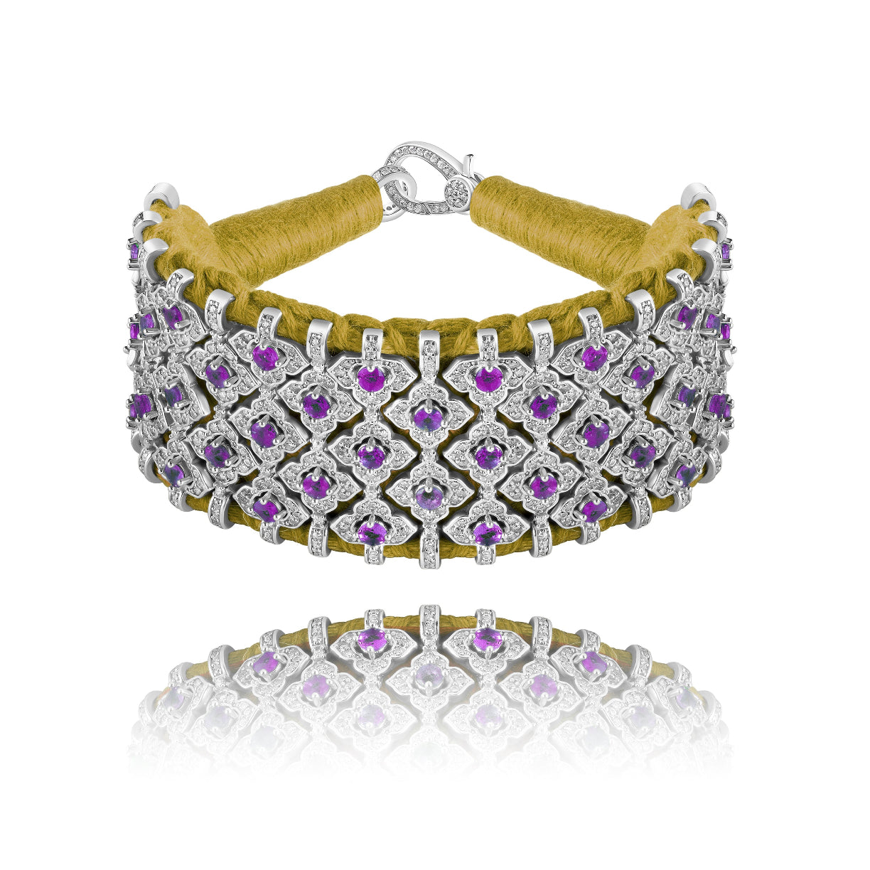 Large manchette en fil de coton tressé couleur mordoré décorée d'une structure en argent 925 entièrement pavée de diamants et d'Améthystes.