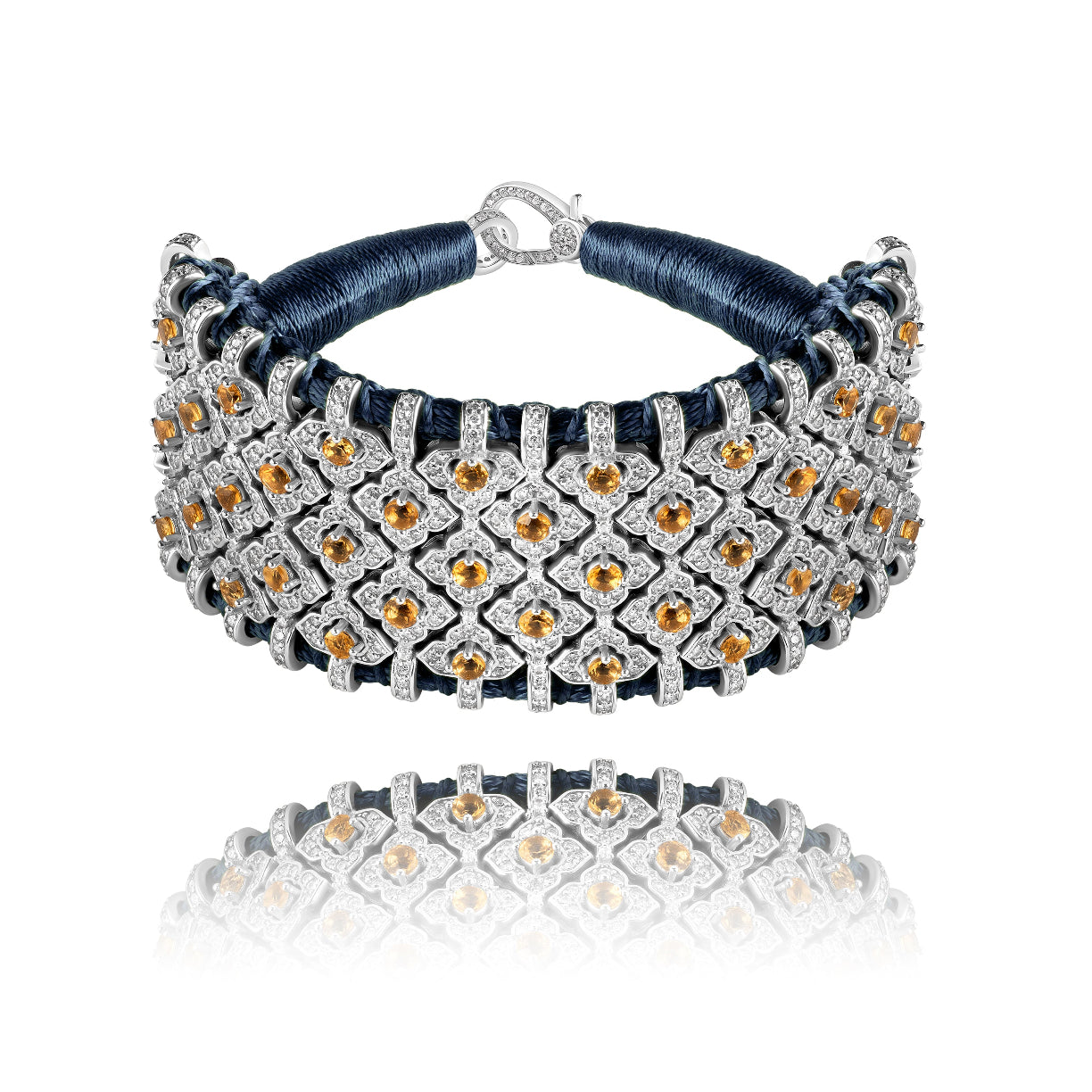 Large manchette en fil de coton tressé de couleur navy décorée d'une structure en argent 925 entièrement pavée de diamants et de pierres citrines.