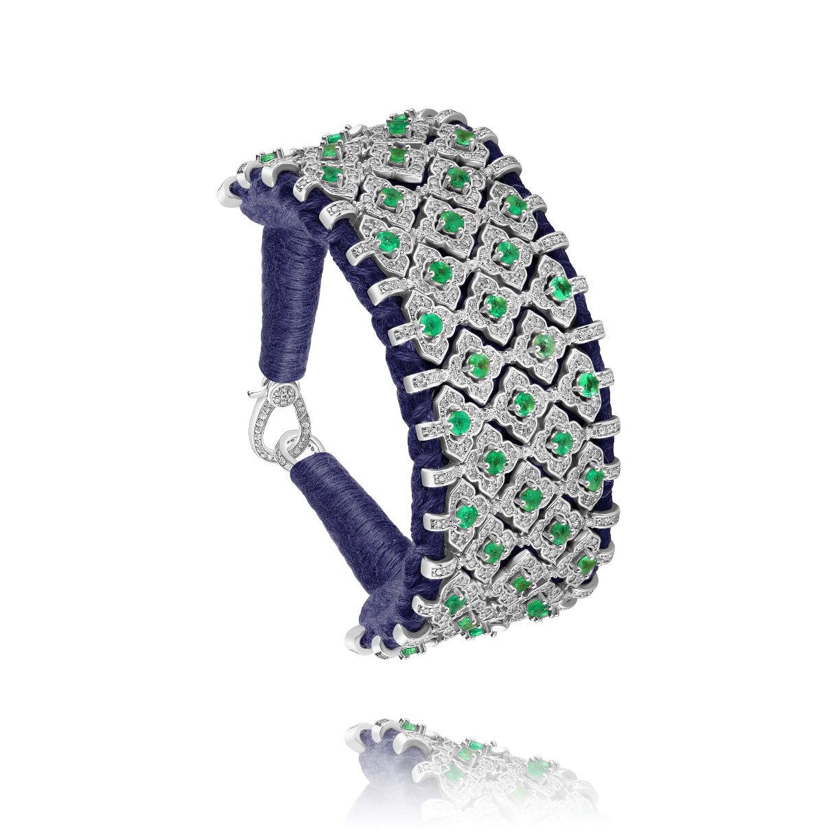 Large manchette en fil de coton tressé de couleur navy décorée d'une structure en argent 925 entièrement pavée de diamants et de pierres émeraudes.