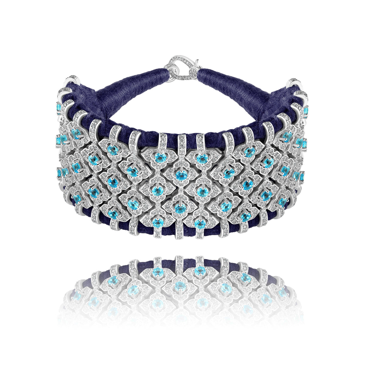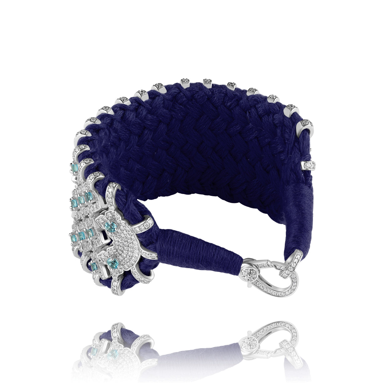 Large manchette en fil de coton tressé de couleur navy décorée d'une structure en argent 925 entièrement pavée de diamants et de pierres topazes.