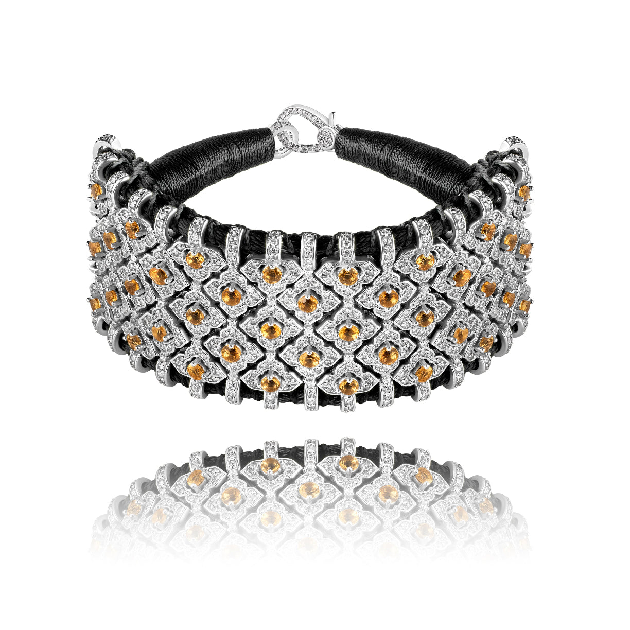 Large manchette en fil de coton tressé de couleur noir décorée d'une structure en argent 925 entièrement pavée de diamants et de pierres citrines.