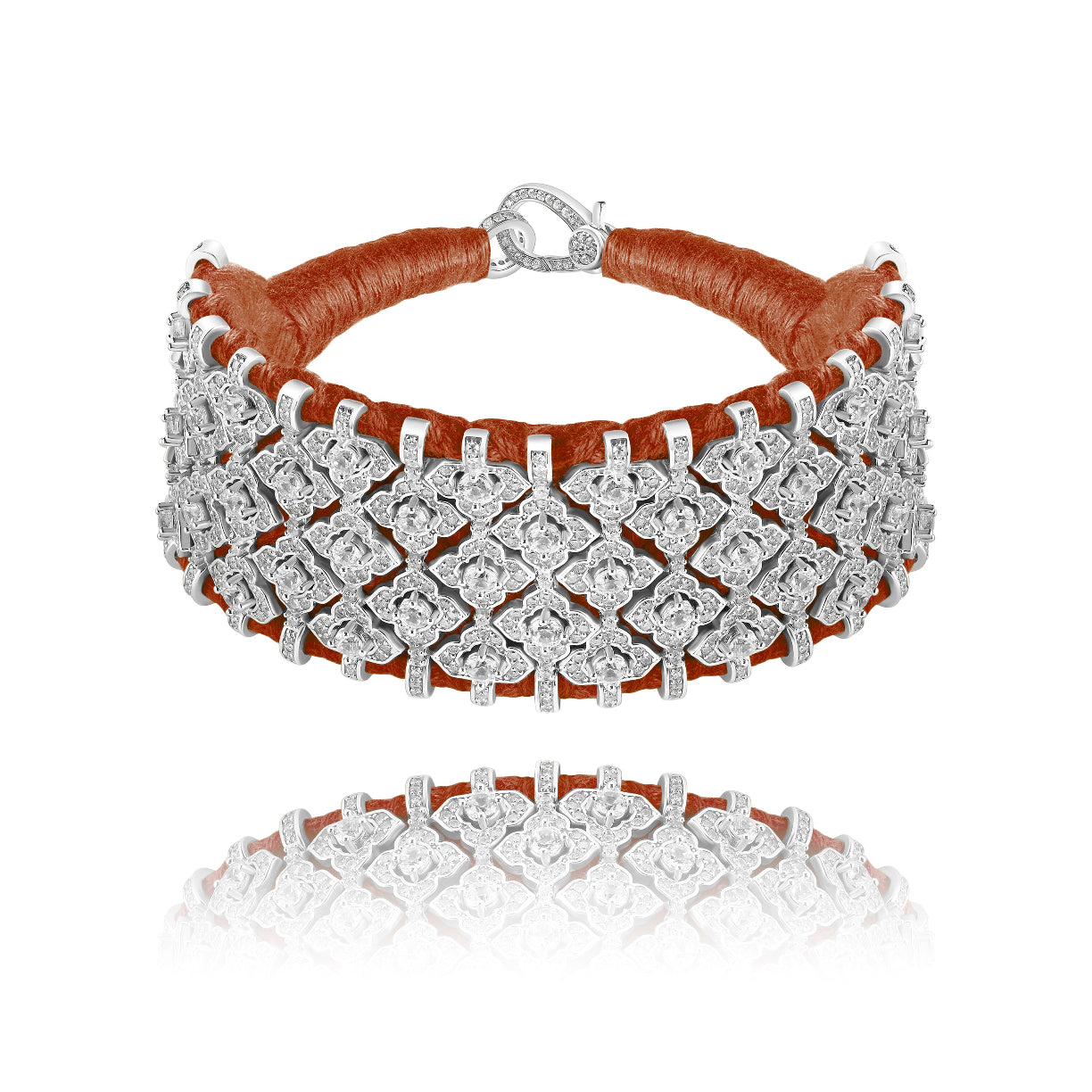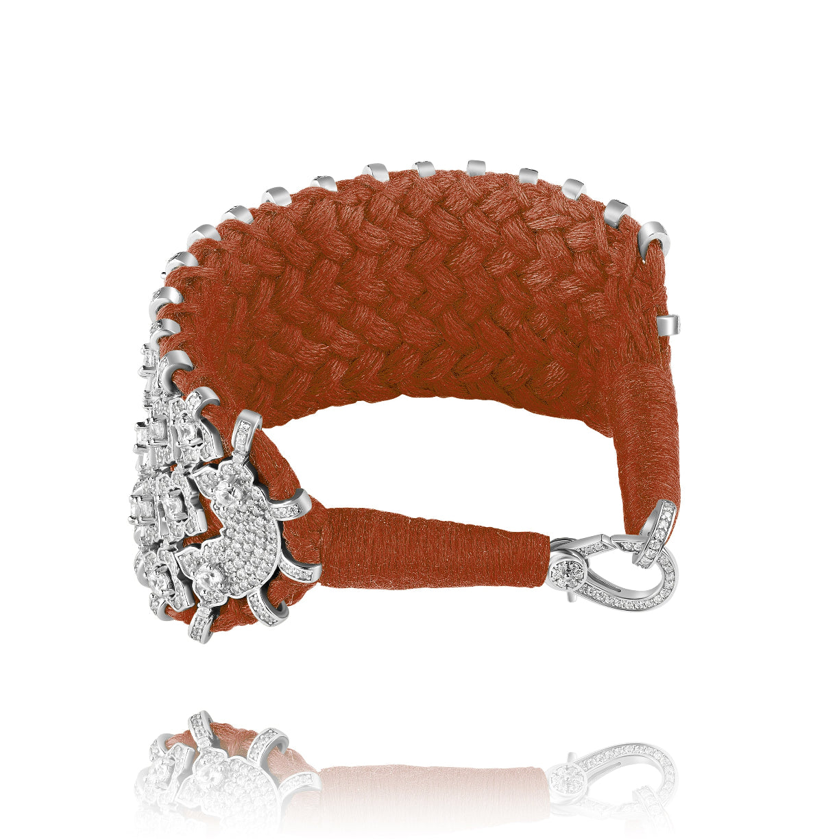 Large manchette en fil de coton tressé de couleur noisette décorée d'une structure en argent 925 entièrement pavée de diamants et de pierres zircons.