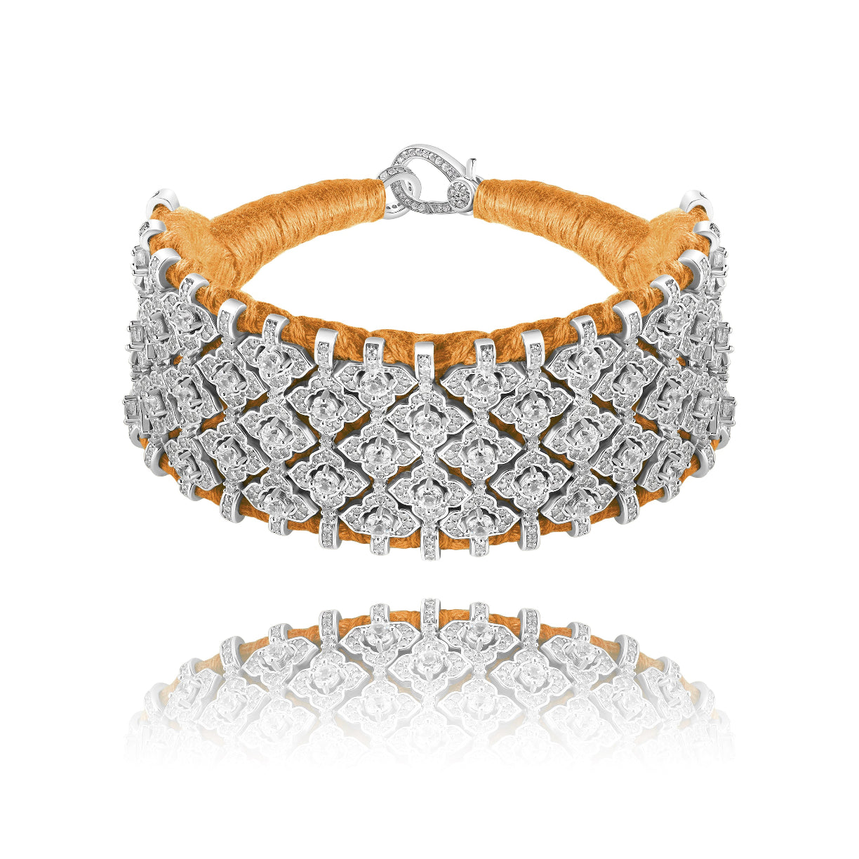 Large manchette en fil de coton tressé de couleur ocre décorée d'une structure en argent 925 entièrement pavée de diamants et de pierres zircons.