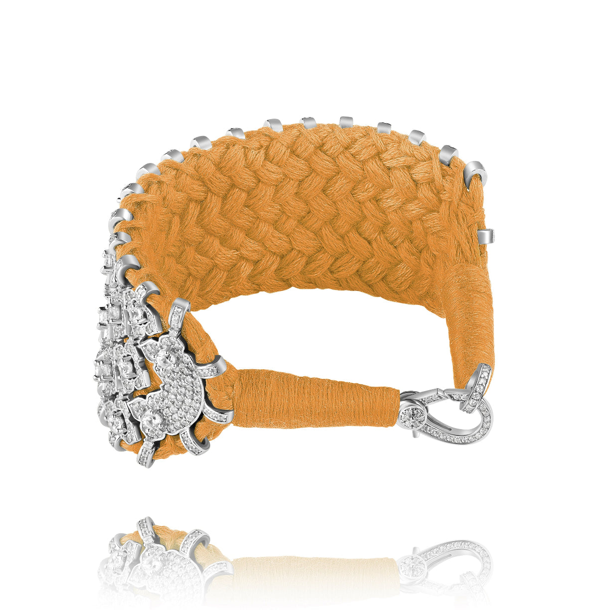 Large manchette en fil de coton tressé de couleur ocre décorée d'une structure en argent 925 entièrement pavée de diamants et de pierres zircons.