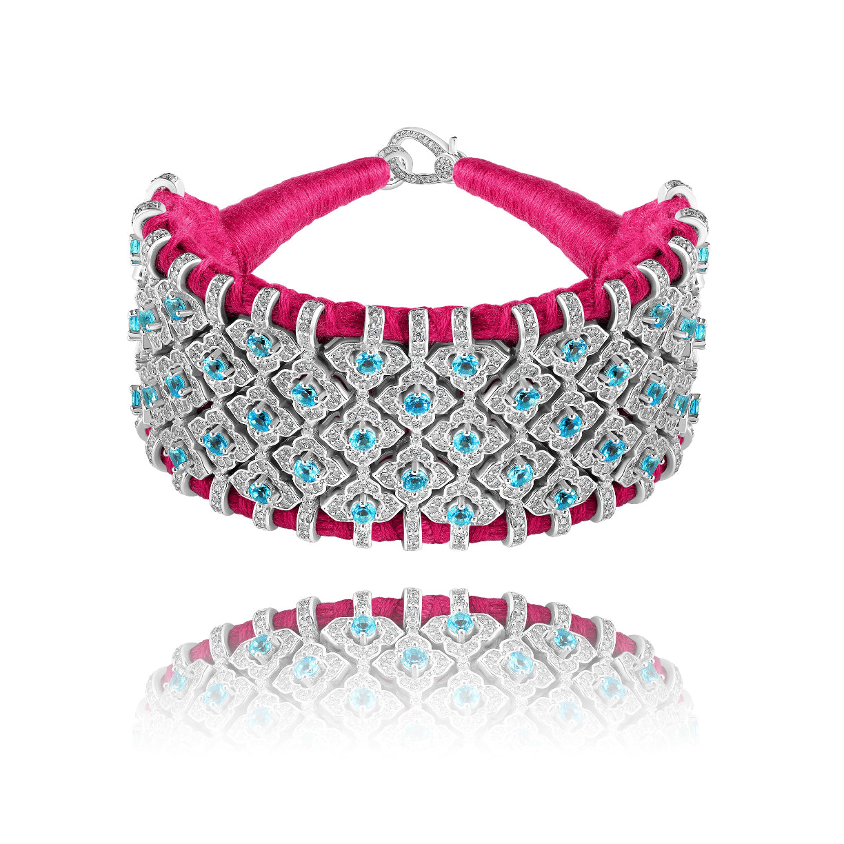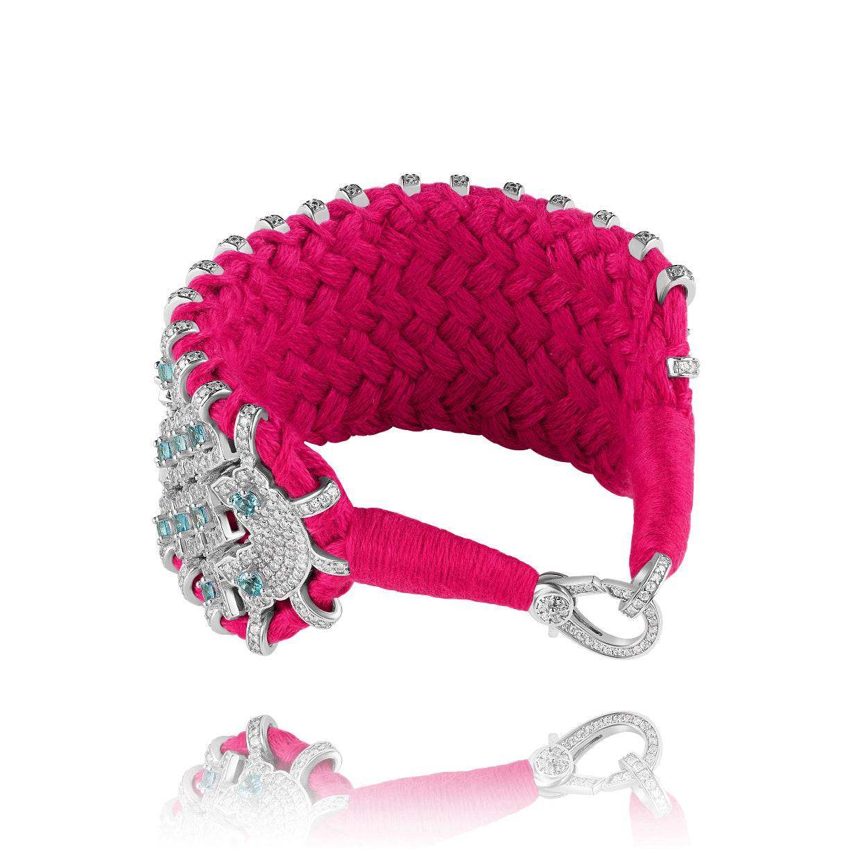 Large manchette en fil de coton tressé de couleur rani décorée d'une structure en argent 925 entièrement pavée de diamants et de pierres topazes.
