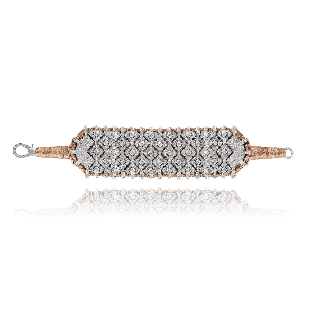 Large manchette en fil de lurex tressé de couleur rose gold décorée d'une structure en argent 925 entièrement pavée de diamants et de pierres zircons.