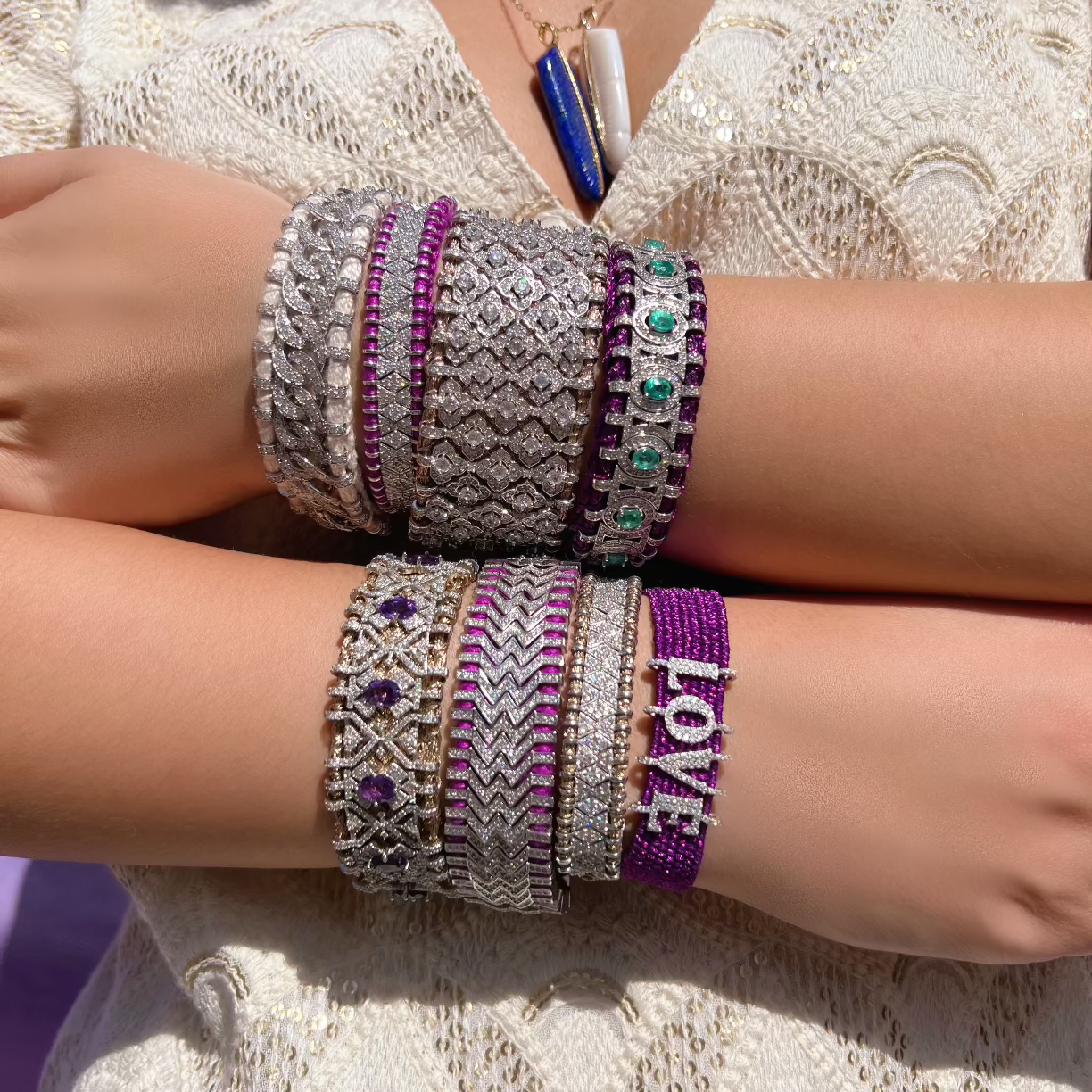 Large manchette en fil de lurex tressé de couleur rose gold décorée d'une structure en argent 925 entièrement pavée de diamants et de pierres zircons.