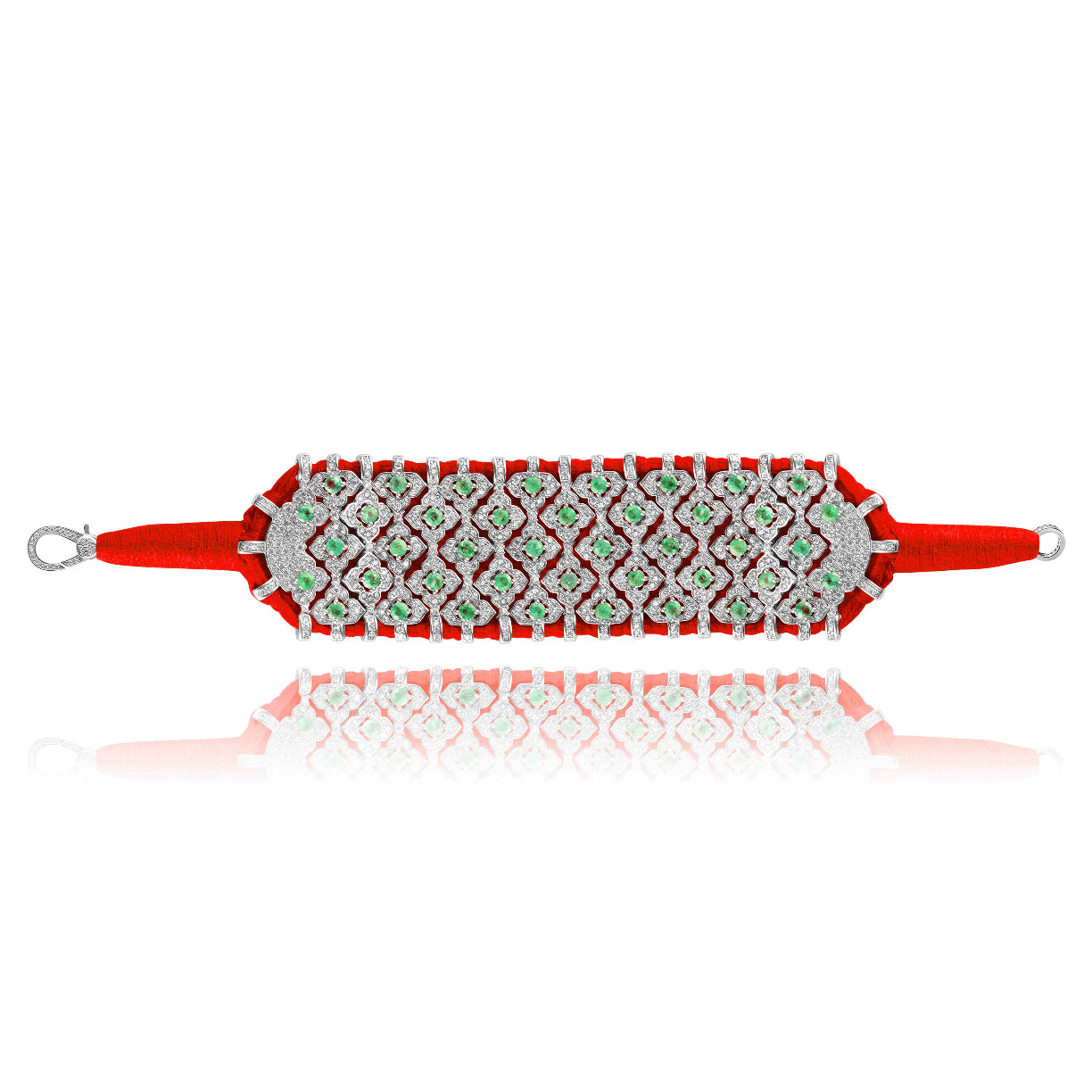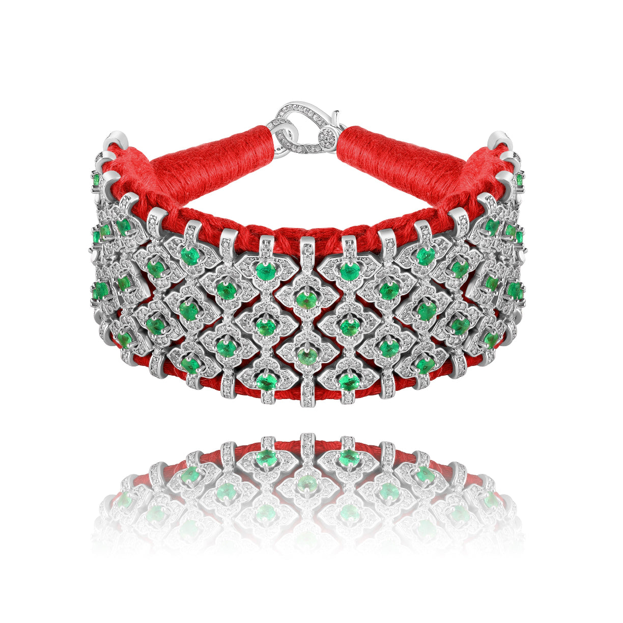 Large manchette en fil de coton tressé de couleur rouge décorée d'une structure en argent 925 entièrement pavée de diamants et de pierres émeraudes.