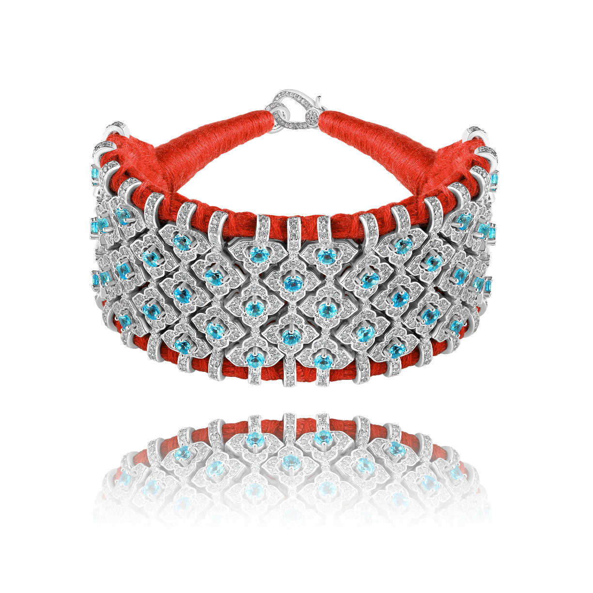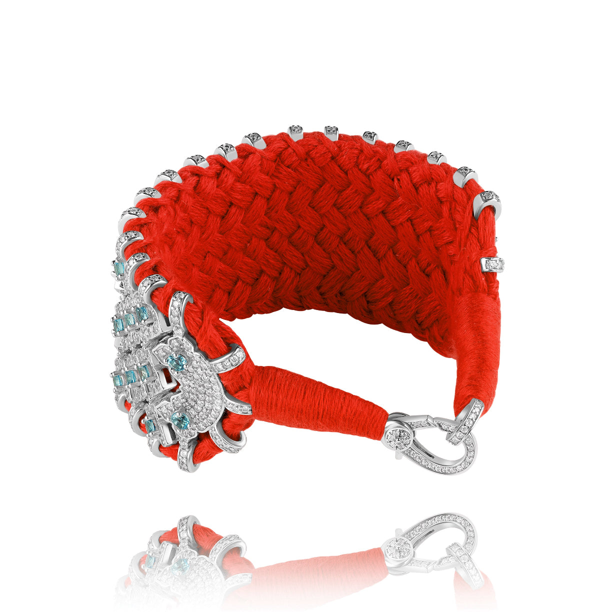 Large manchette en fil de coton tressé de couleur rouge décorée d'une structure en argent 925 entièrement pavée de diamants et de pierres topazes.