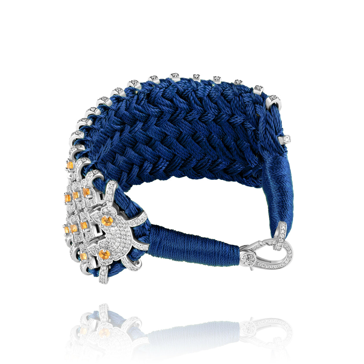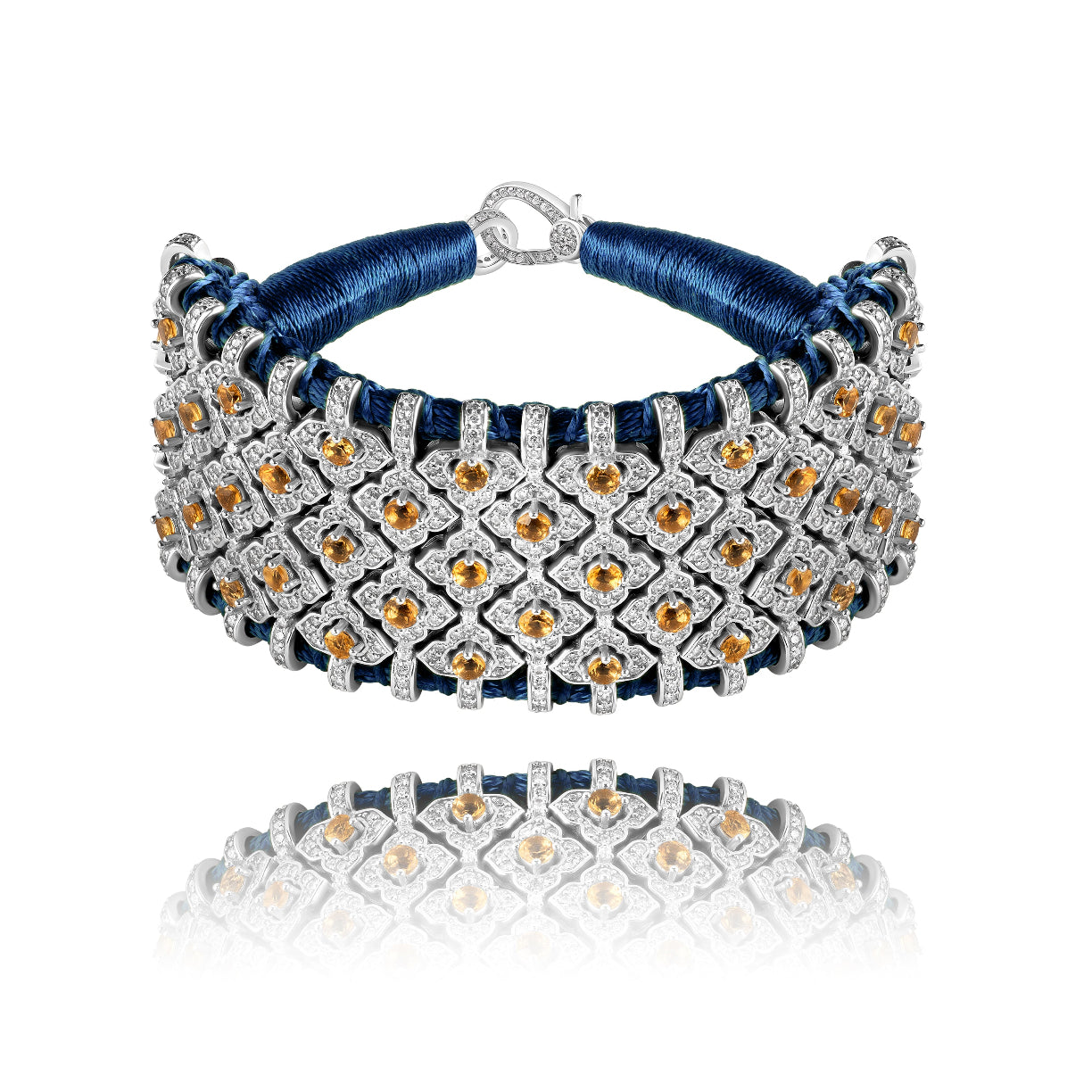 Large manchette en fil de coton tressé de couleur roy décorée d'une structure en argent 925 entièrement pavée de diamants et de pierres citrines.
