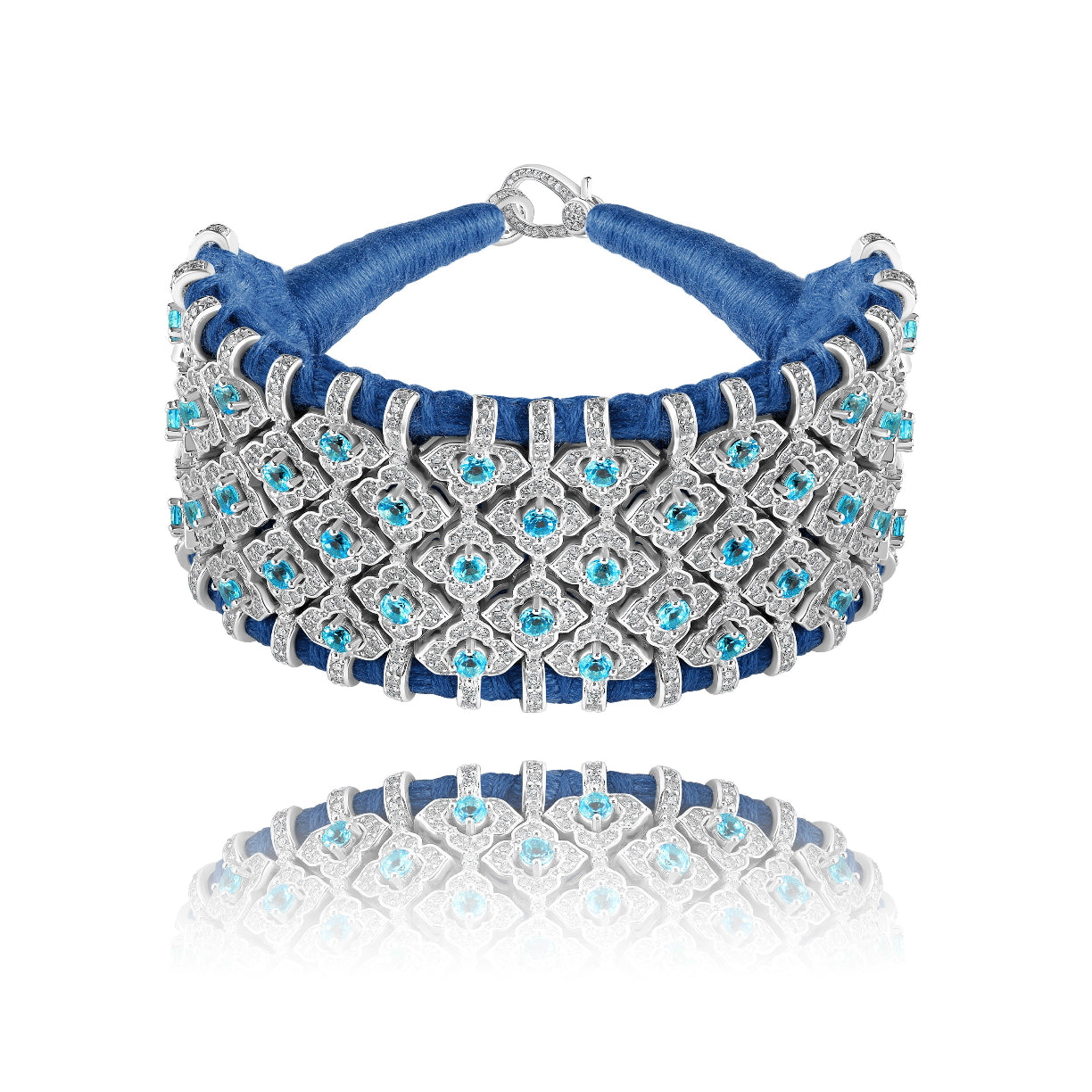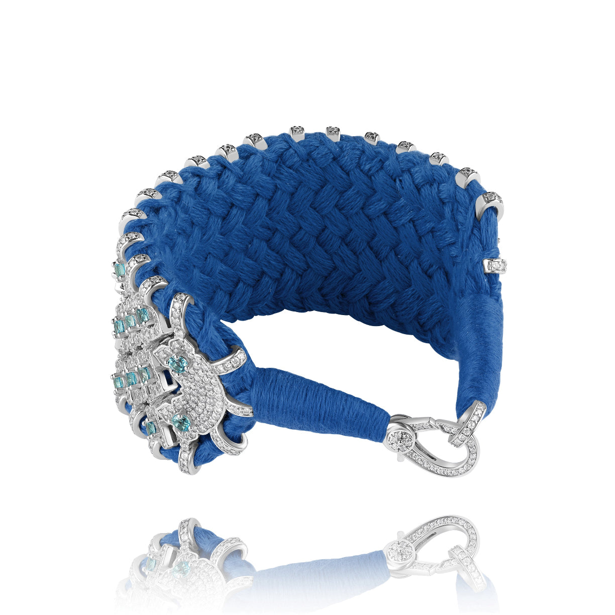 Large manchette en fil de coton tressé de couleur roy décorée d'une structure en argent 925 entièrement pavée de diamants et de pierres topazes.