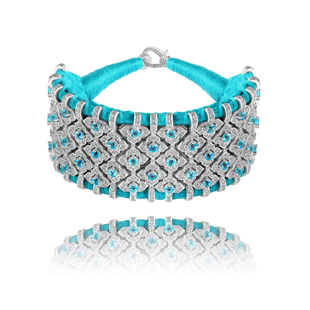 Large manchette en fil de coton tressé de couleur turquoise décorée d'une structure en argent 925 entièrement pavée de diamants et de pierres topazes.