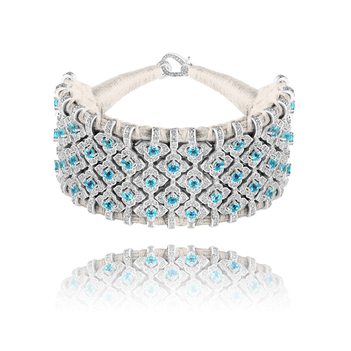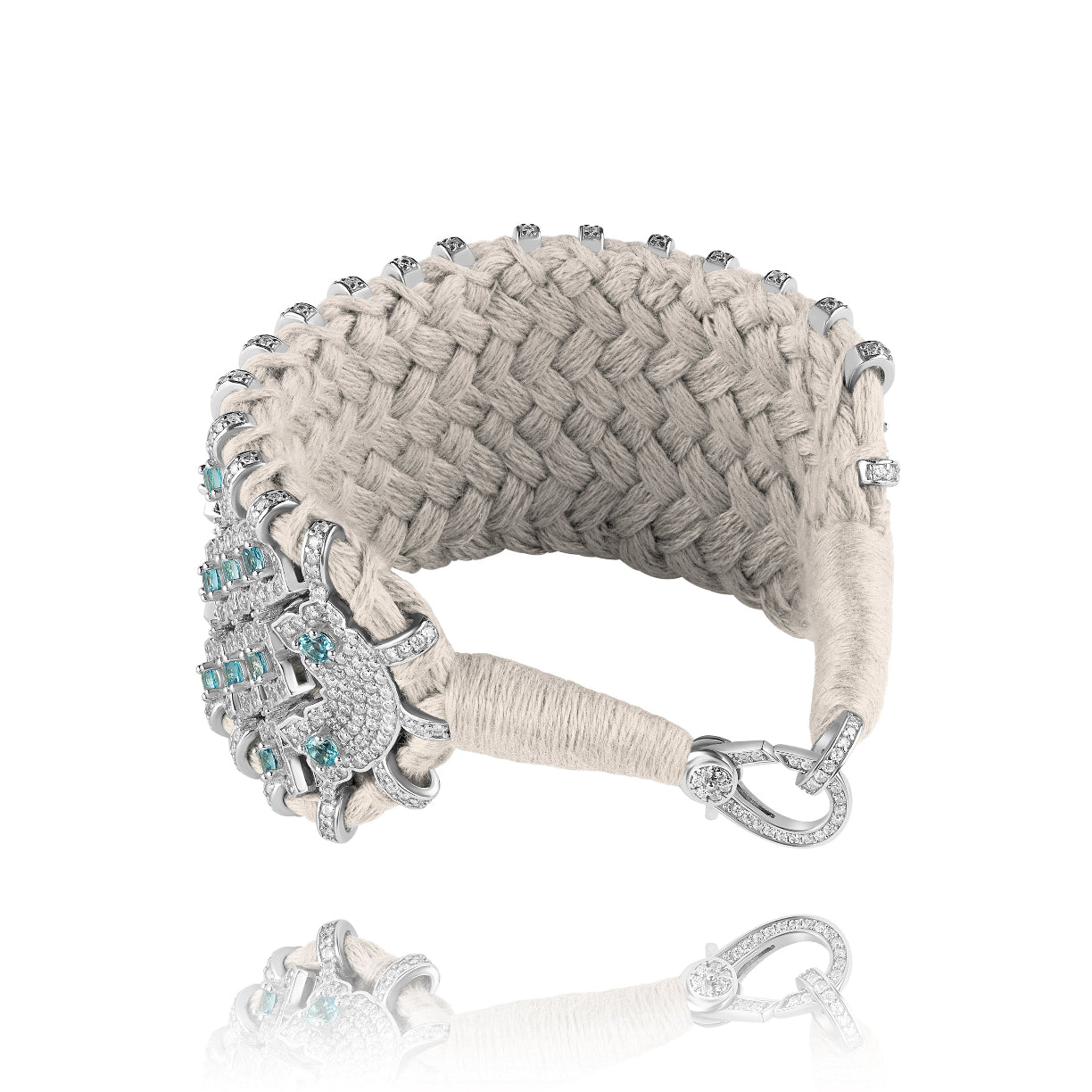 Large manchette en fil de coton tressé de couleur vanille décorée d'une structure en argent 925 entièrement pavée de diamants et de pierres topazes.