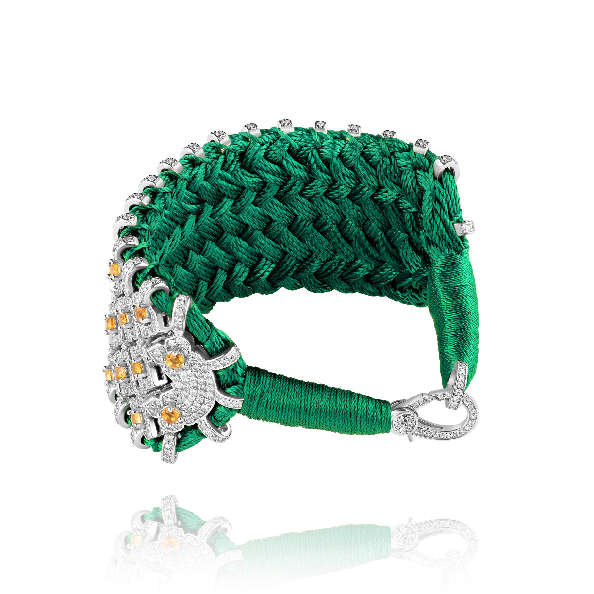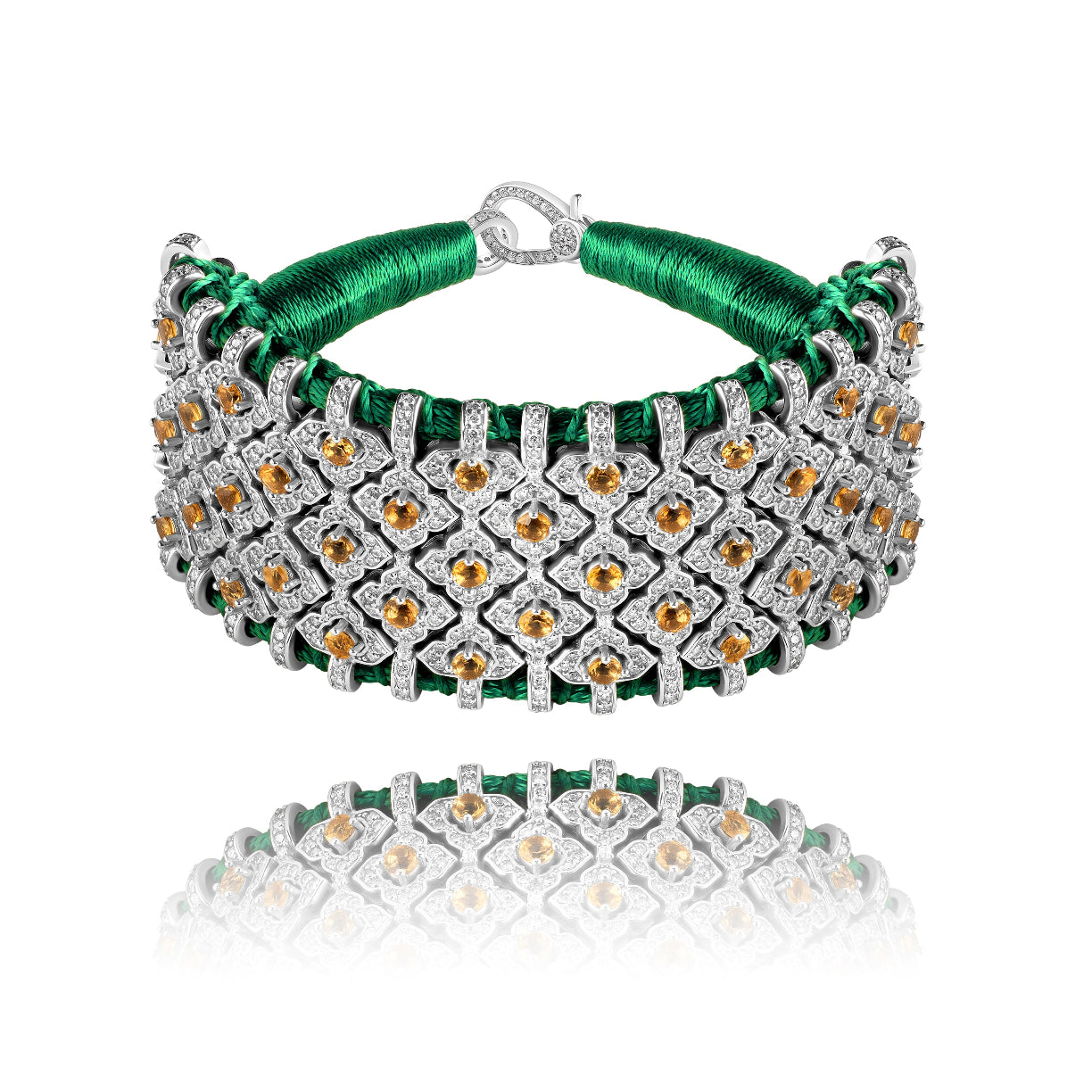 Large manchette en fil de coton tressé de couleur vert décorée d'une structure en argent 925 entièrement pavée de diamants et de pierres citrines.