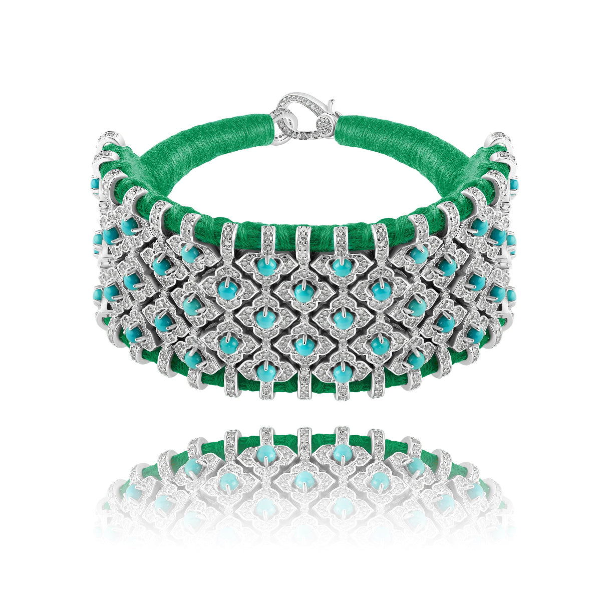 Large manchette en fil de coton tressé de couleur vert décorée d'une structure en argent 925 entièrement pavée de diamants et de pierres turquoises.