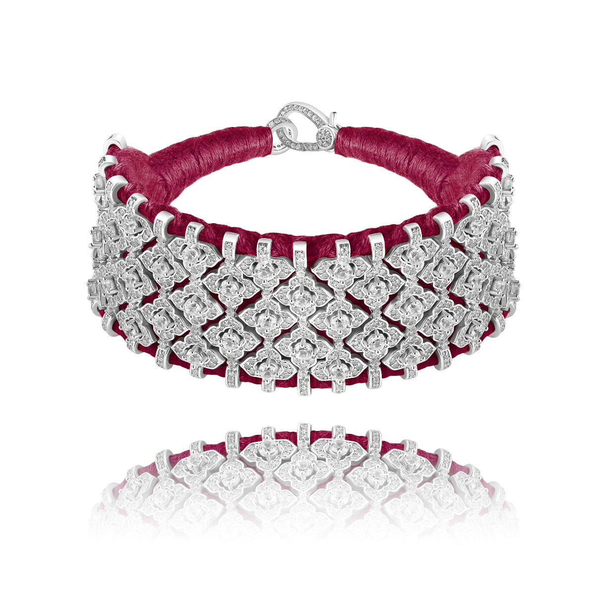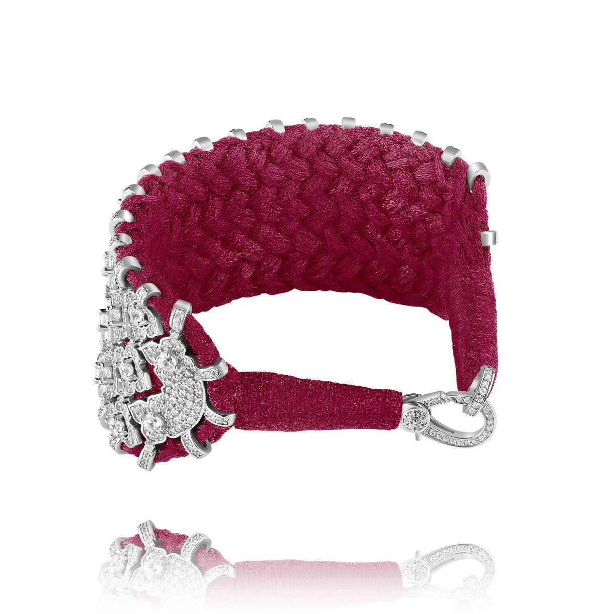 Large manchette en fil de coton tressé de couleur vignes décorée d'une structure en argent 925 entièrement pavée de diamants et de pierres zircons.