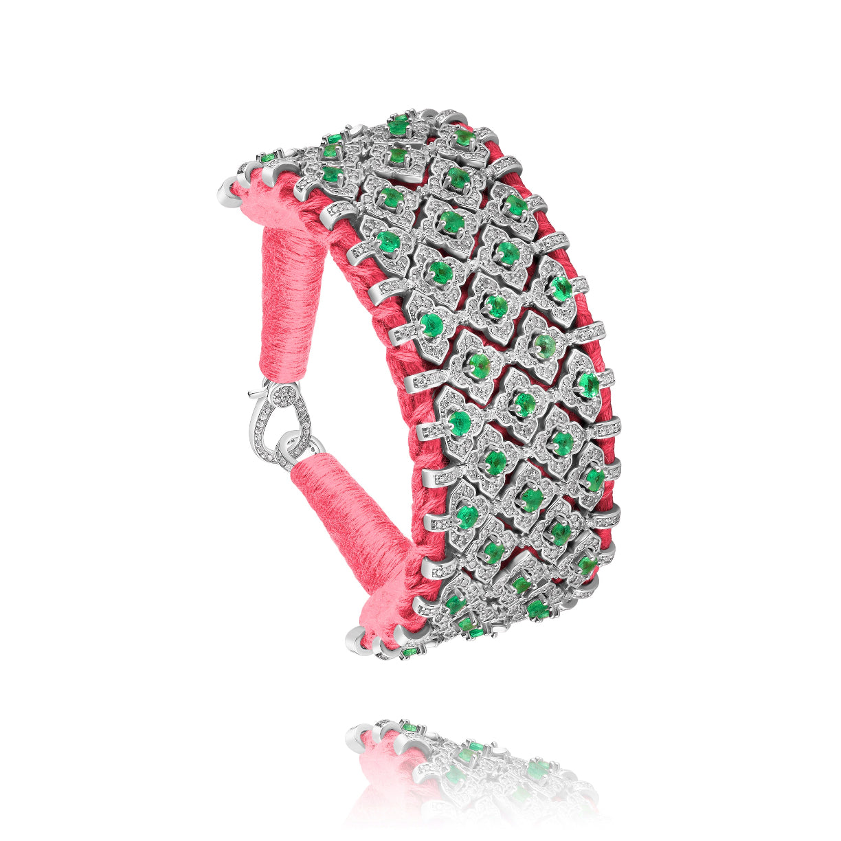 Large manchette en fil de coton tressé de couleur cheeks décorée d'une structure en argent 925 entièrement pavée de diamants et de pierres émeraudes.