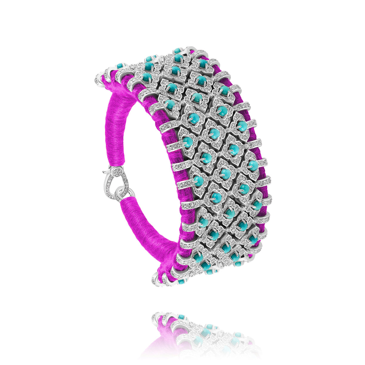 Large manchette en fil de coton tressé de couleur violet décorée d'une structure en argent 925 entièrement pavée de diamants et de pierres turquoises.