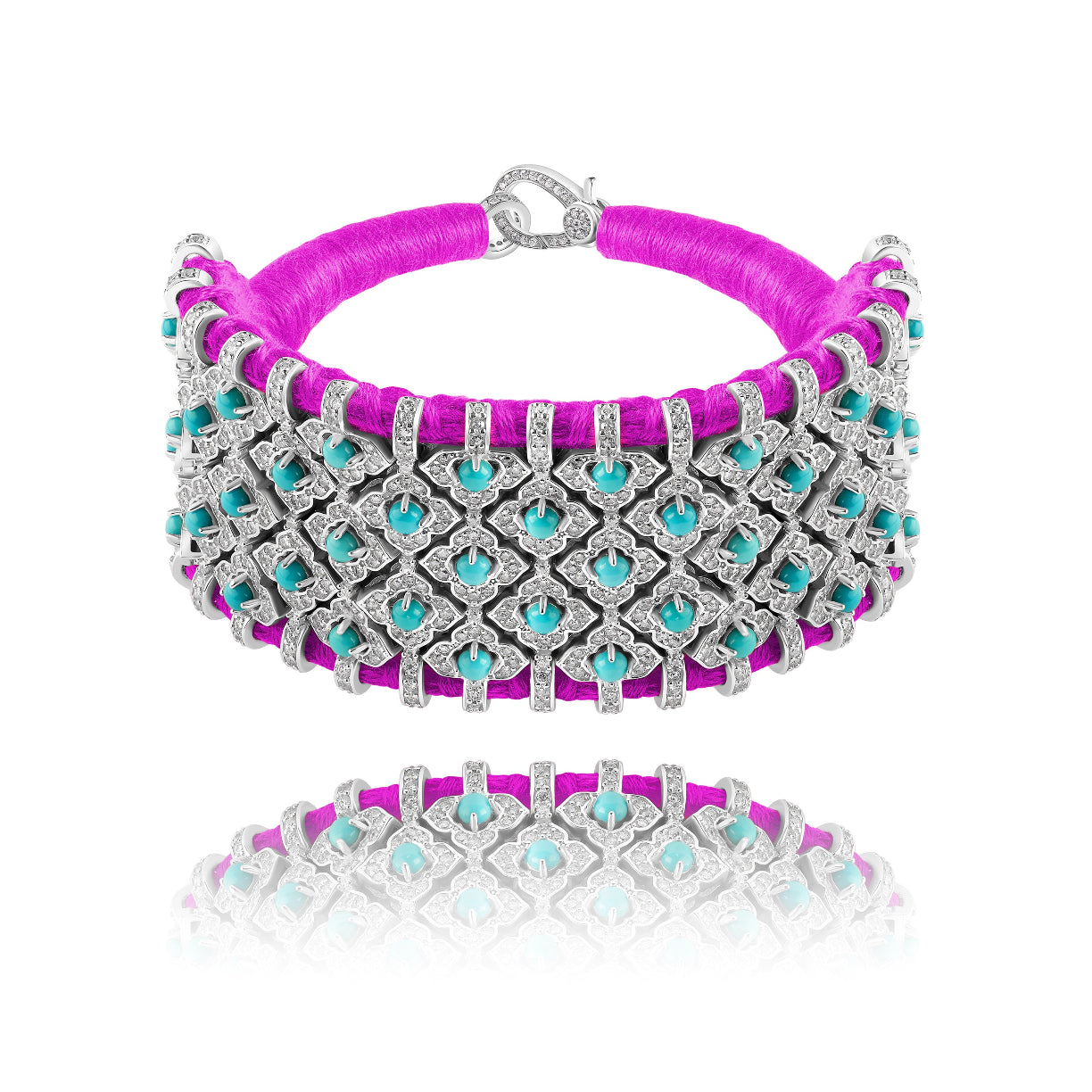 Large manchette en fil de coton tressé de couleur violet décorée d'une structure en argent 925 entièrement pavée de diamants et de pierres turquoises.