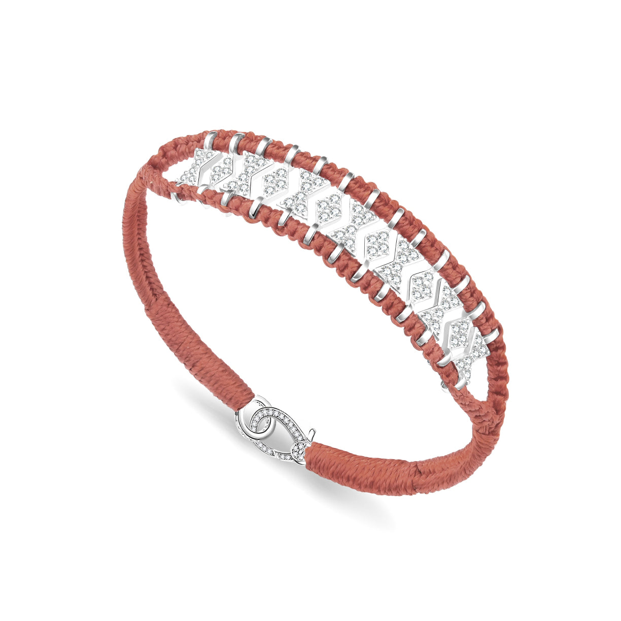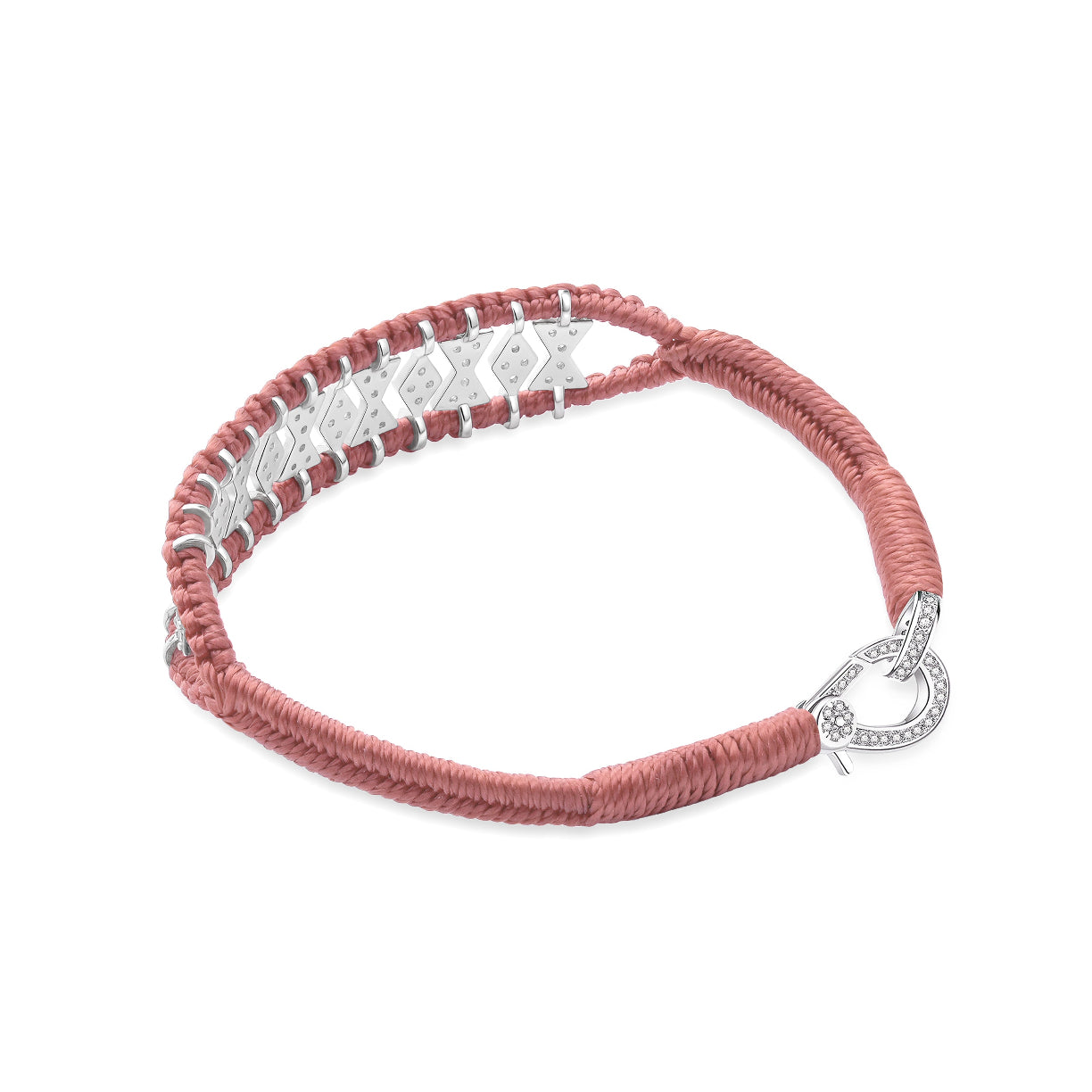 Bracelet fin en fil de coton tressé de couleur blush, décoré d’un motif en argent 925 et serti de moissanites.