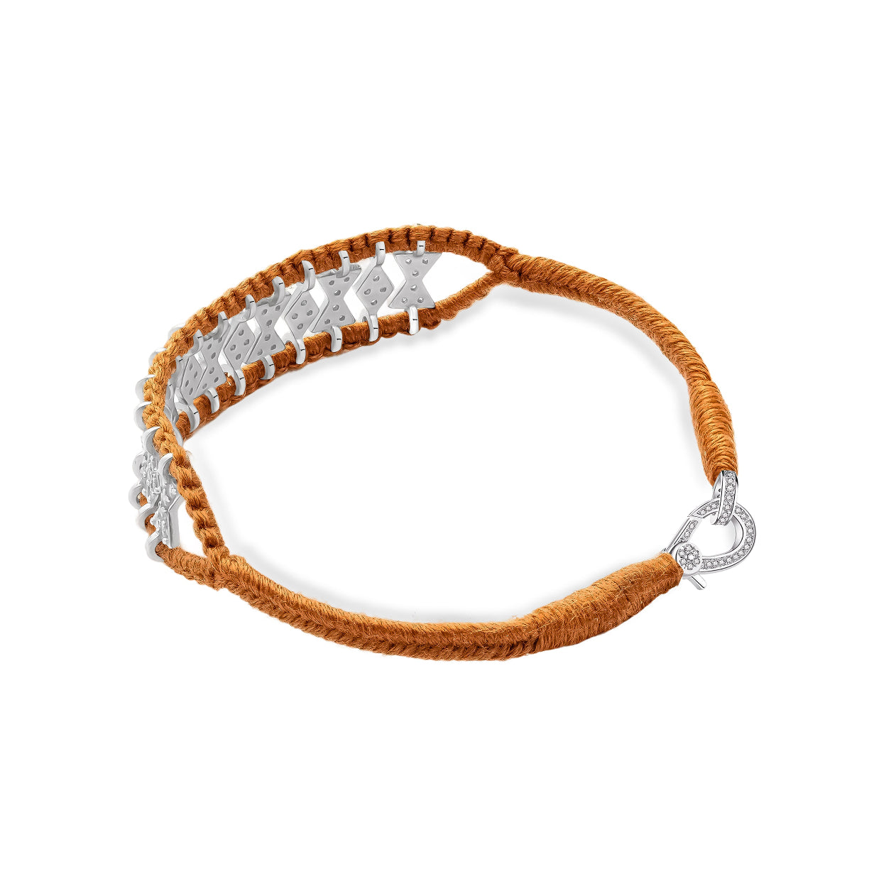 Bracelet fin en fil de coton tressé de couleur camel, décoré d’un motif en argent 925 et serti de moissanites.