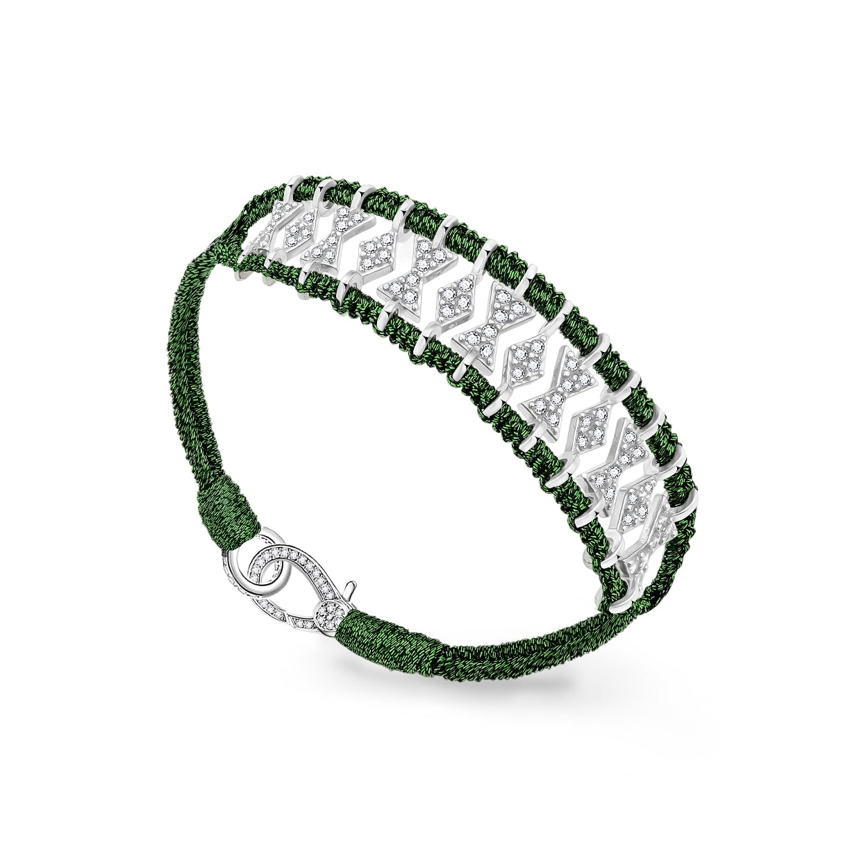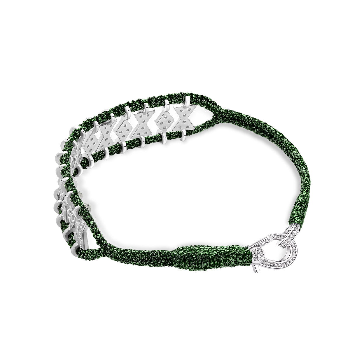 Bracelet fin en fil de lurex tressé de couleur pin, décoré d’un motif en argent 925 et serti de moissanites.