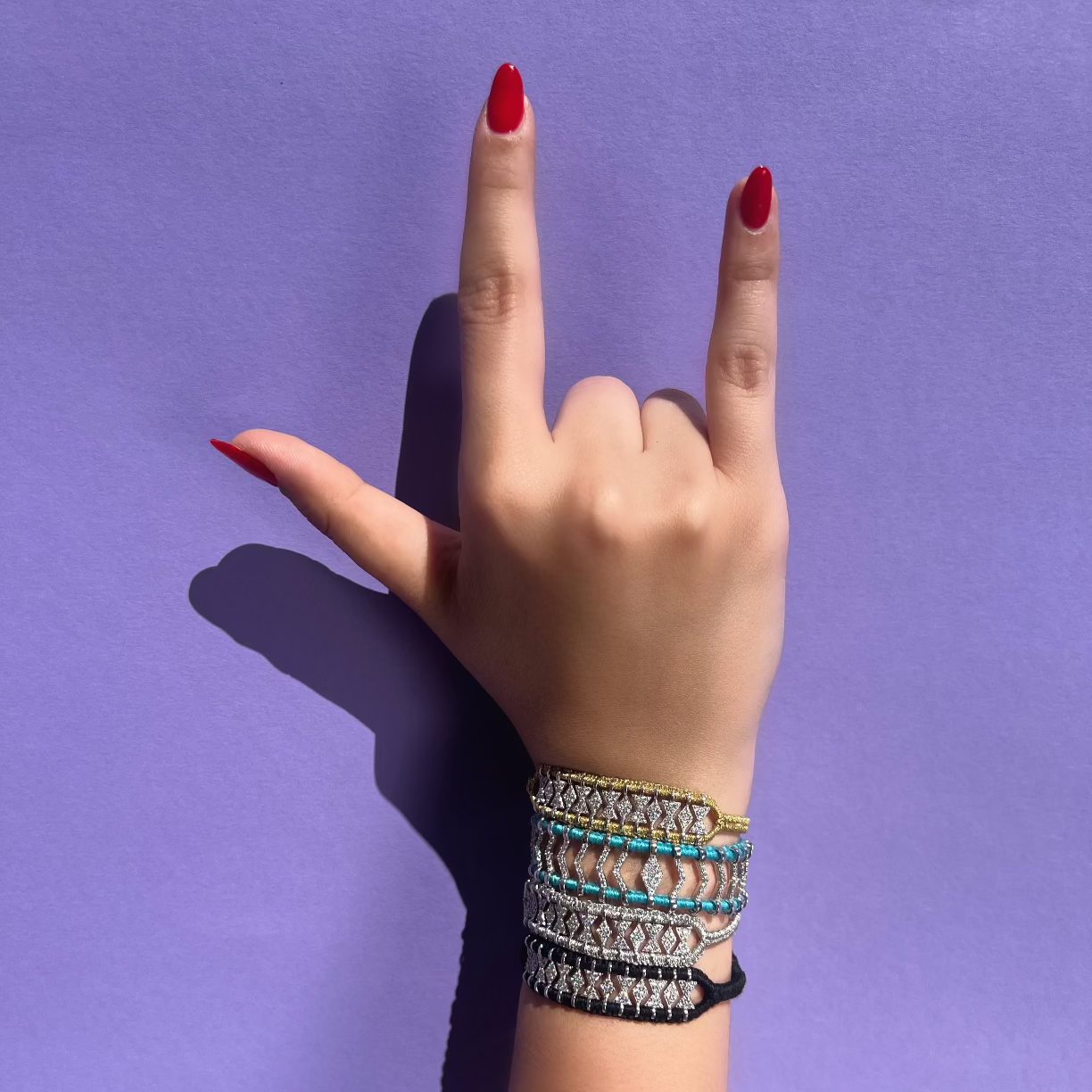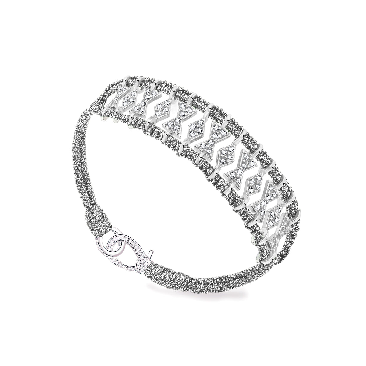 Bracelet fin en fil de lurex tressé de couleur argent, décoré d’un motif en argent 925 et serti de moissanites.