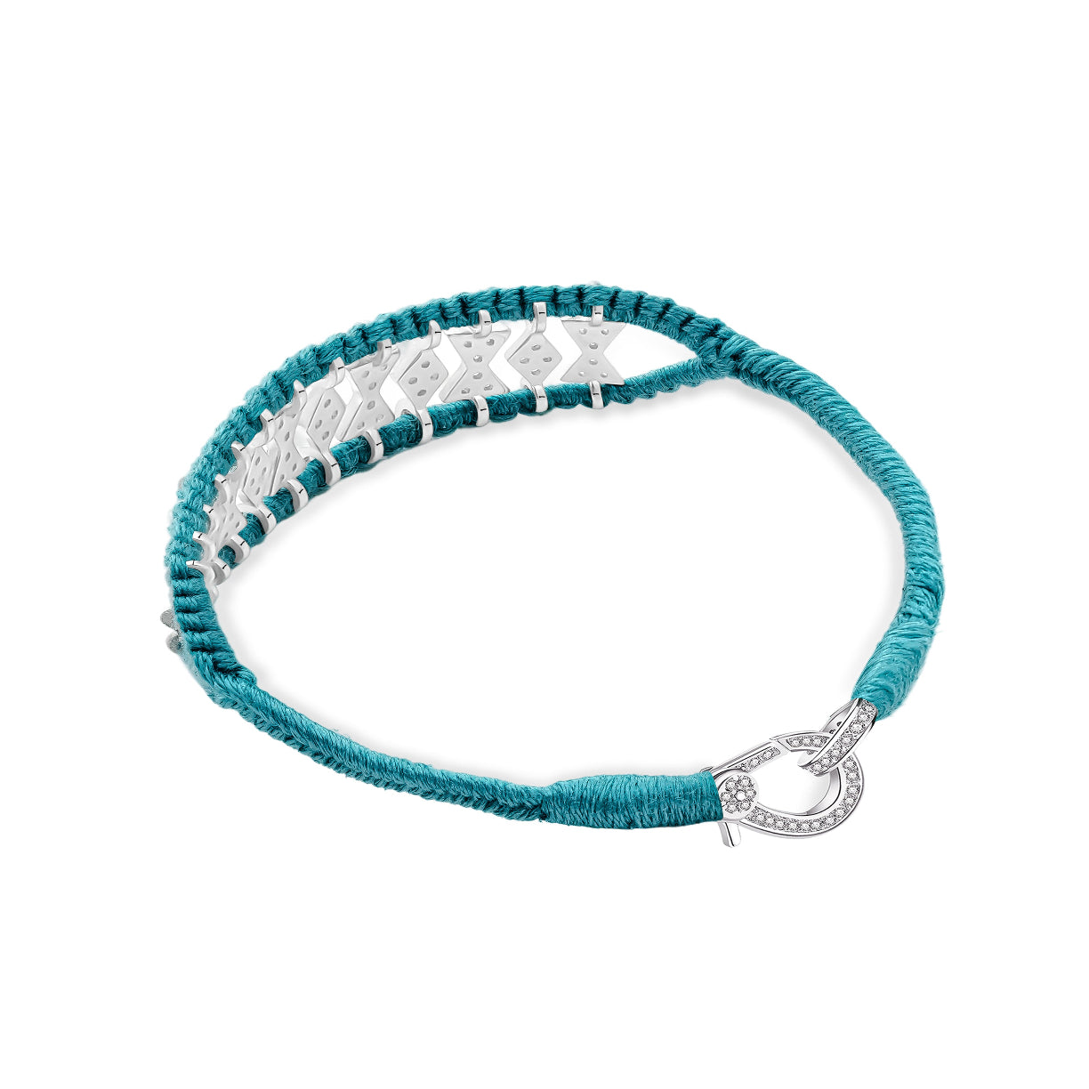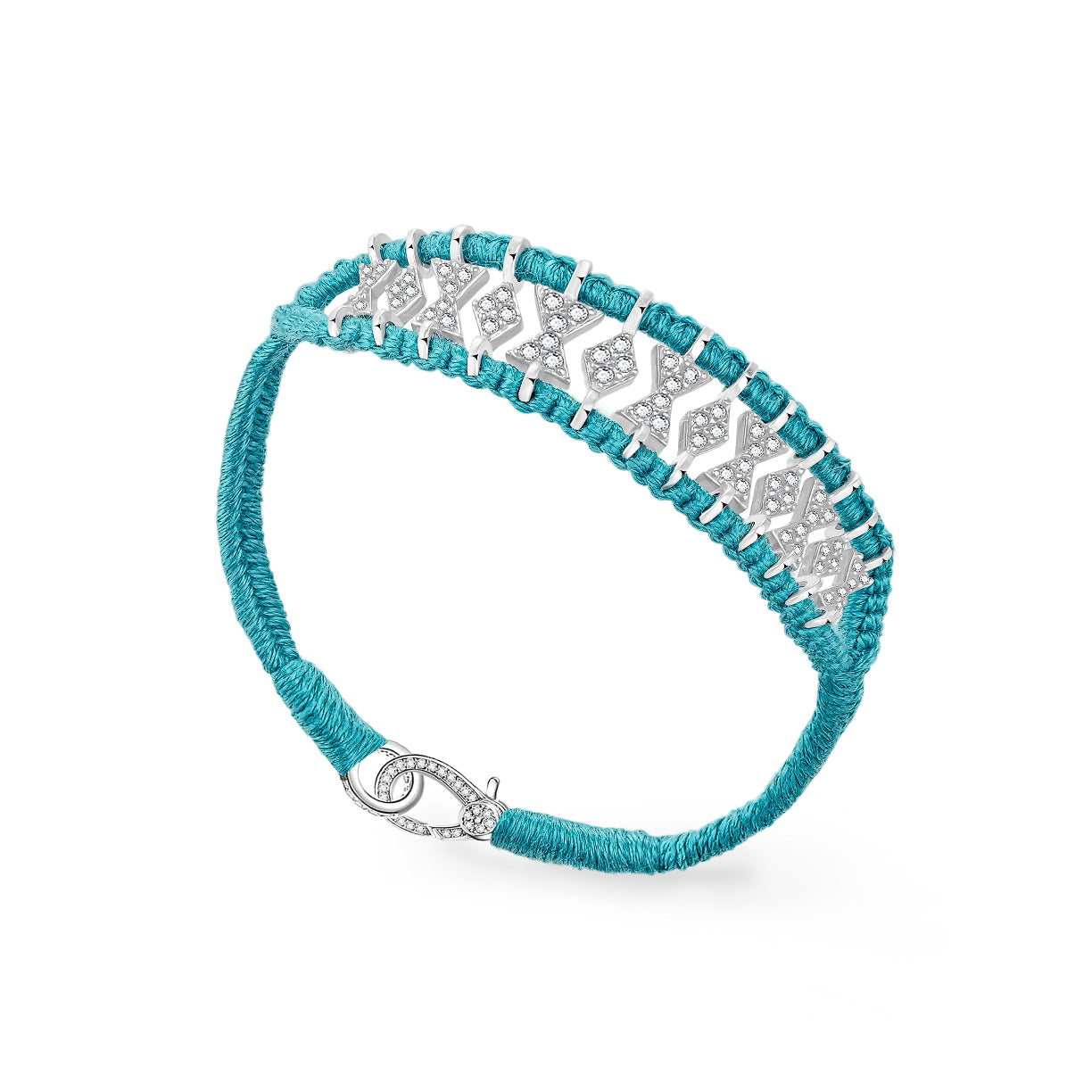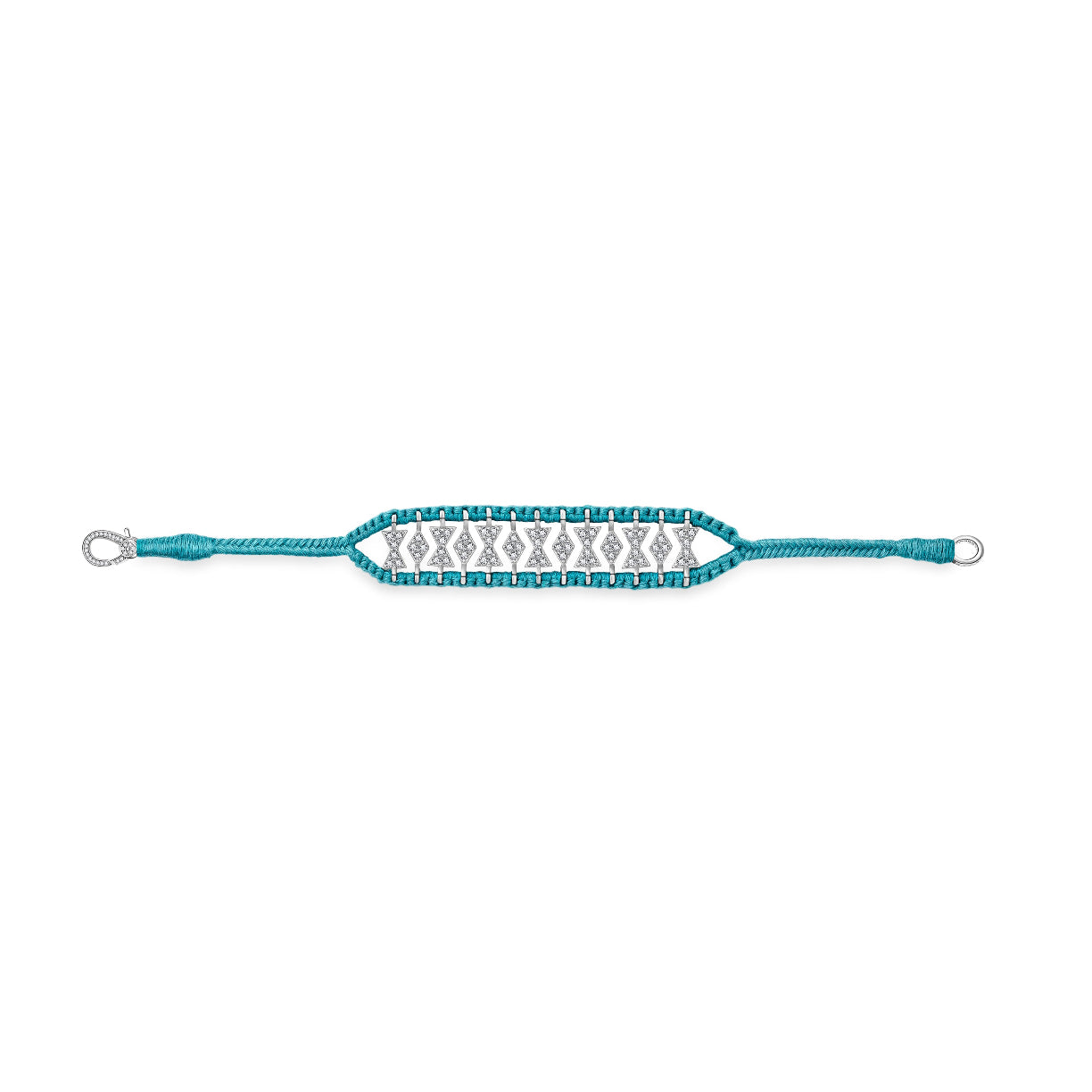 Bracelet fin en fil de coton tressé de couleur turquoise, décoré d’un motif en argent 925 et serti de moissanites.