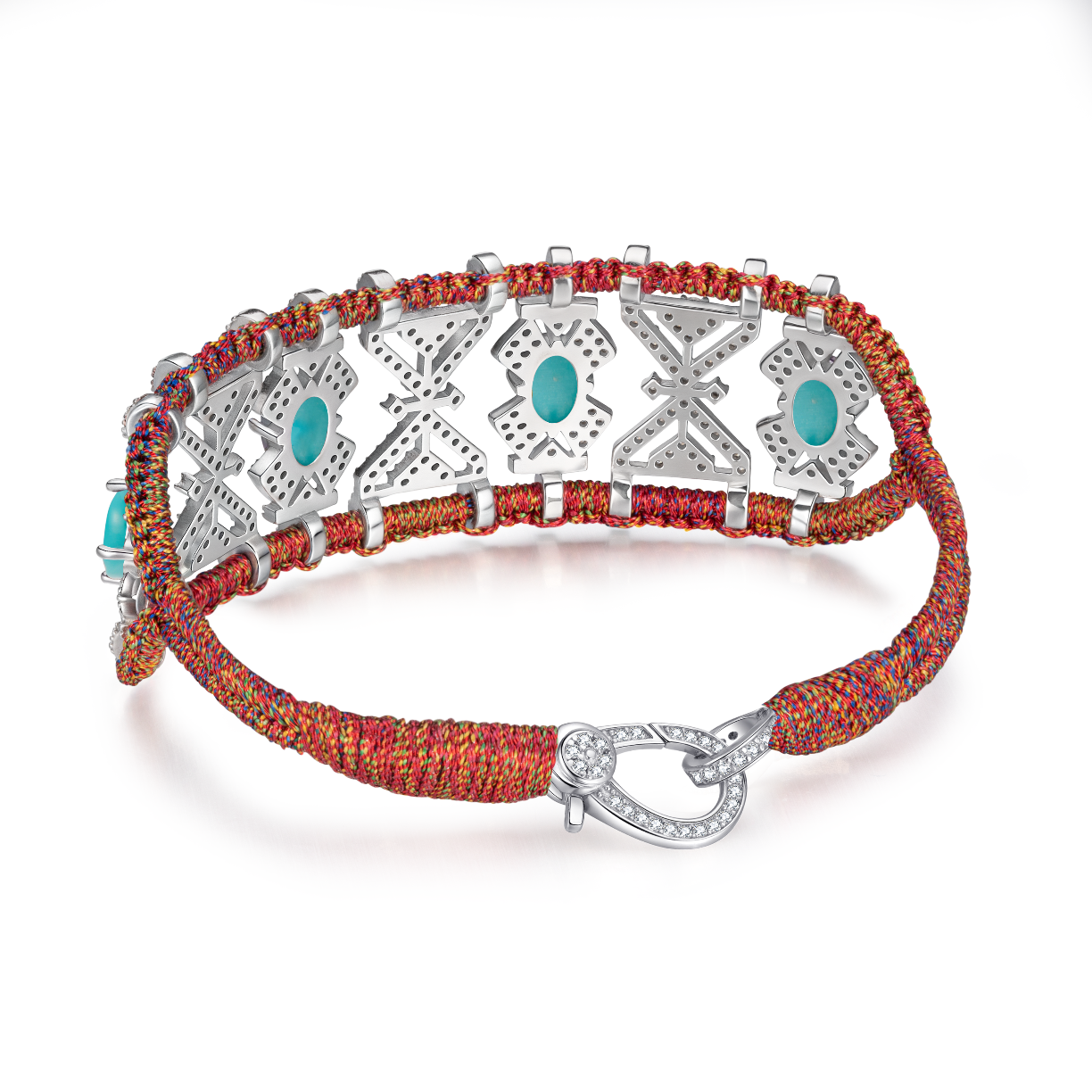 Bracelet ajouré en fil de lurex tressé couleur red shanti orné d'un motif en argent 925 entièrement pavé de moissanites et rehaussé de turquoises.