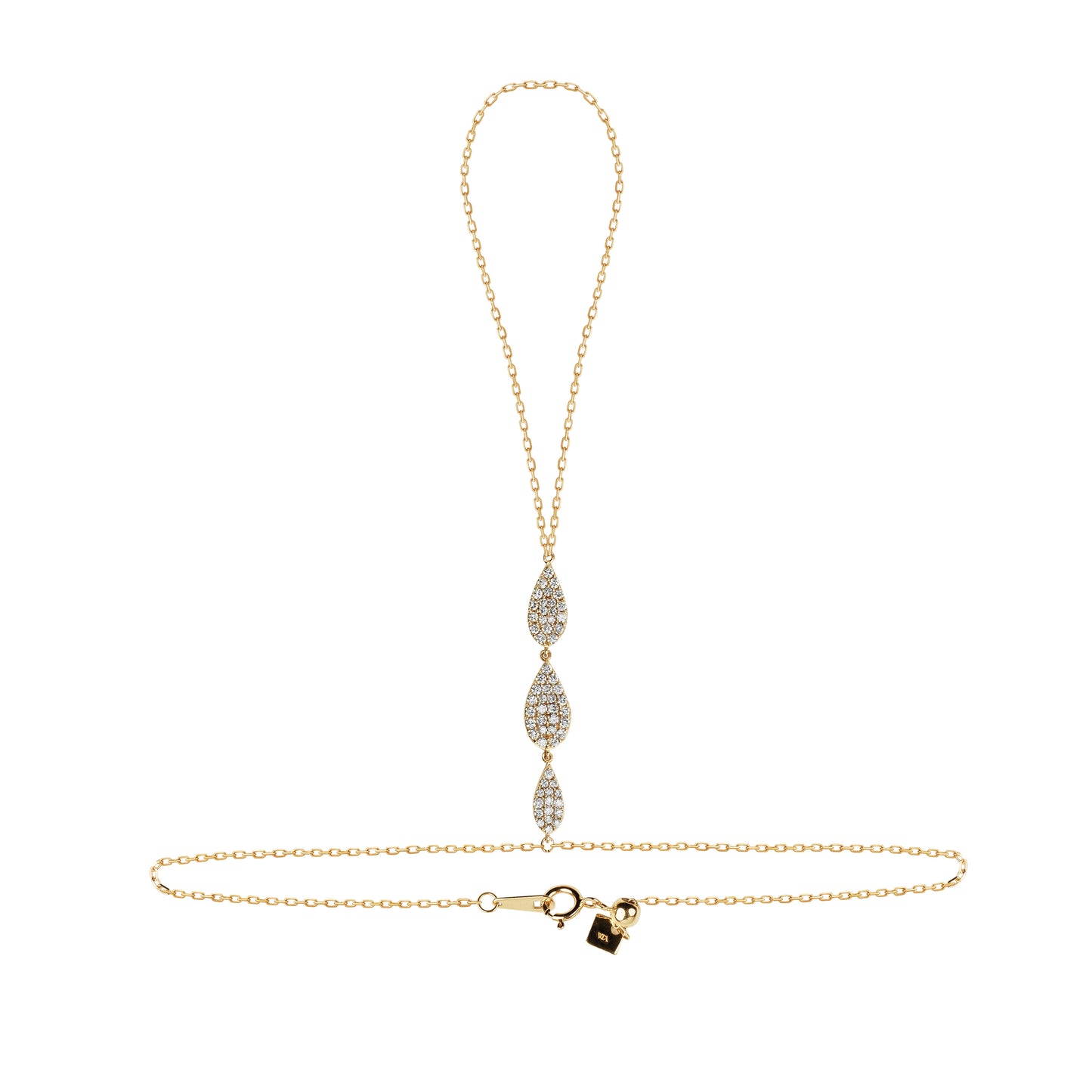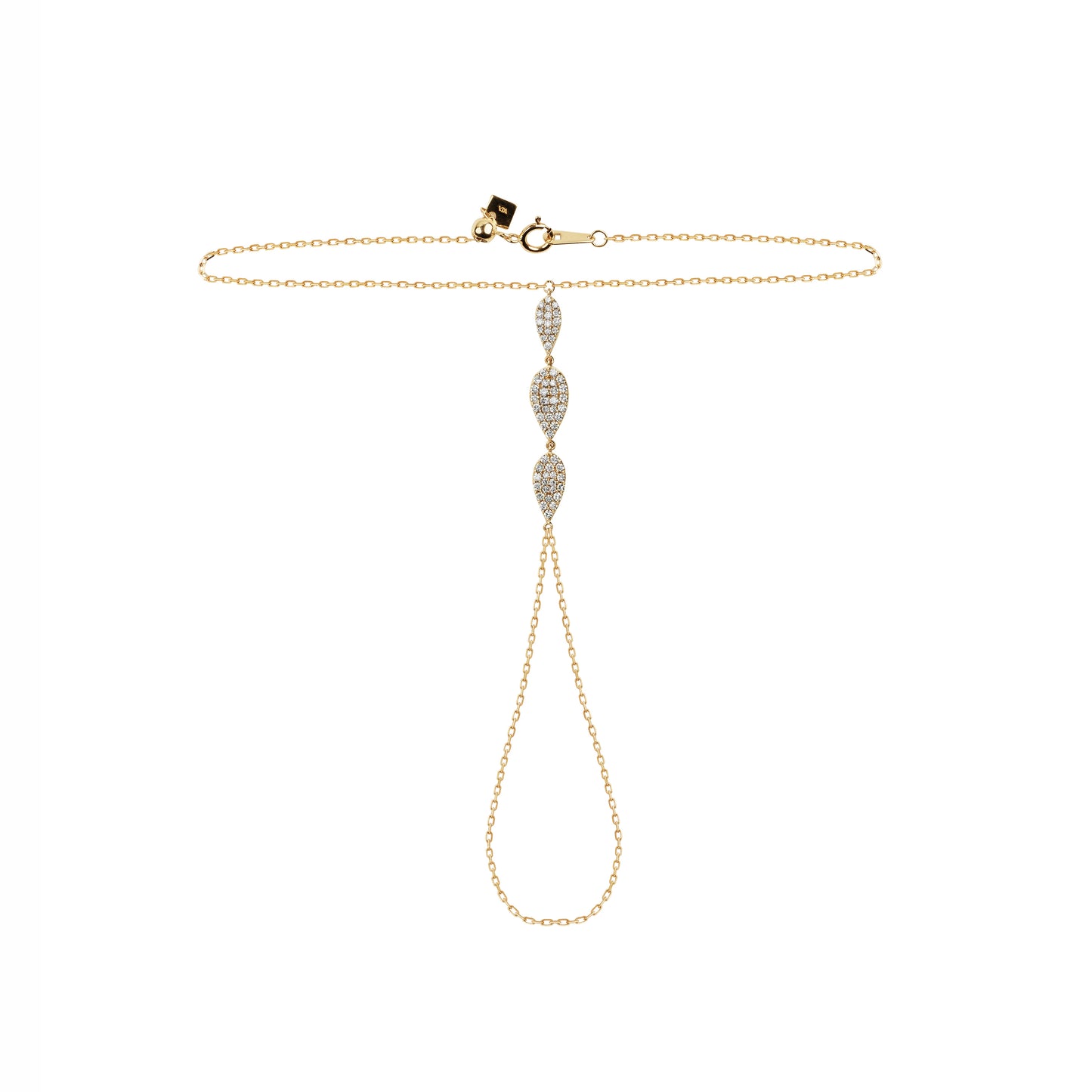 Ce bracelet est d'une élégance infinie ! Composé d'une chaîne en or rose 18 carats qui embrasse délicatement votre poignet et longue le dos de votre main en la parant de trois fines pampilles en diamants, avant de se refermer autour de votre doigt. Une pièce discrète et remarquable à la fois.