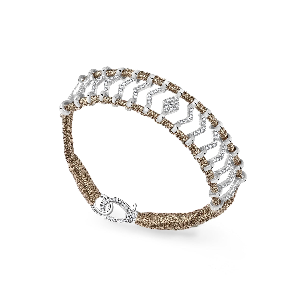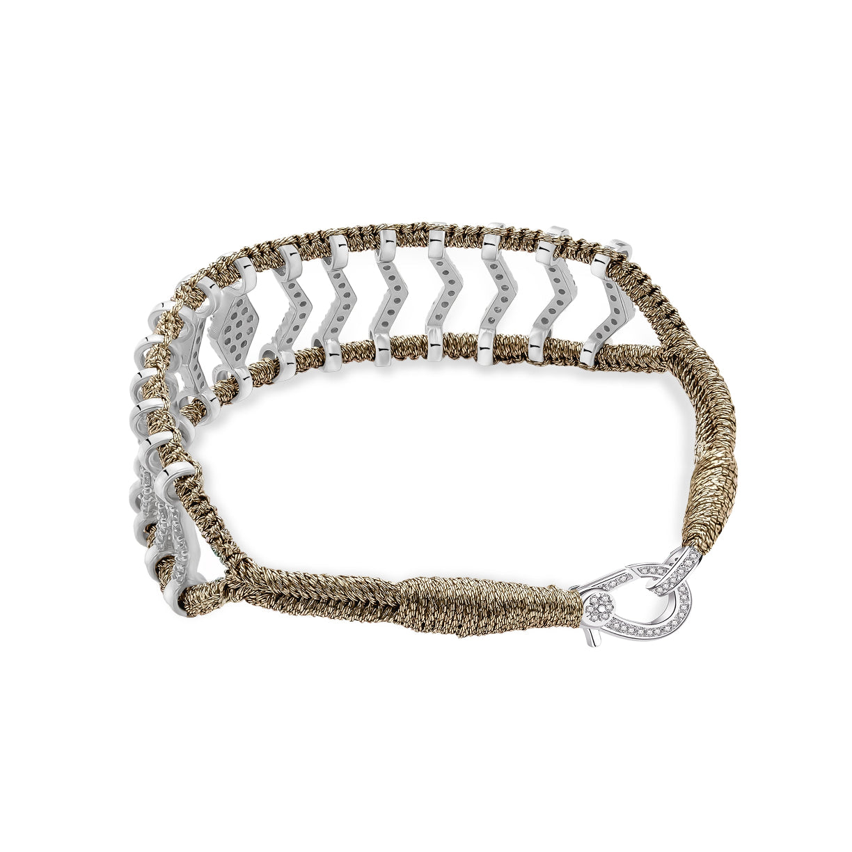 Bracelet fin en fil de lurex tressé de couleur brass, décoré d’un motif en argent 925 et serti de moissanites.