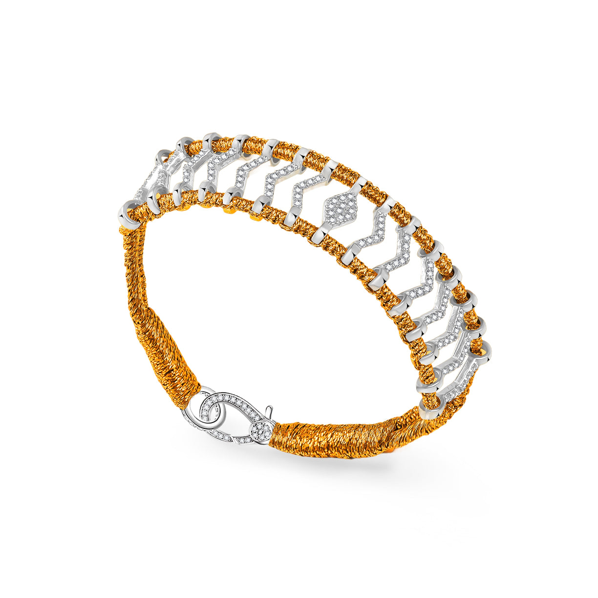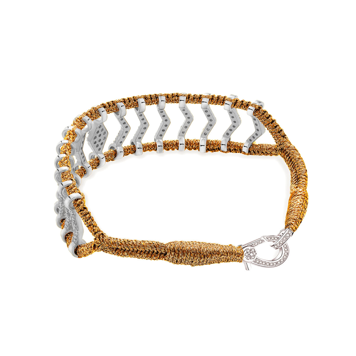Bracelet fin en fil de lurex tressé de couleur copper, décoré d’un motif en argent 925 et serti de moissanites.