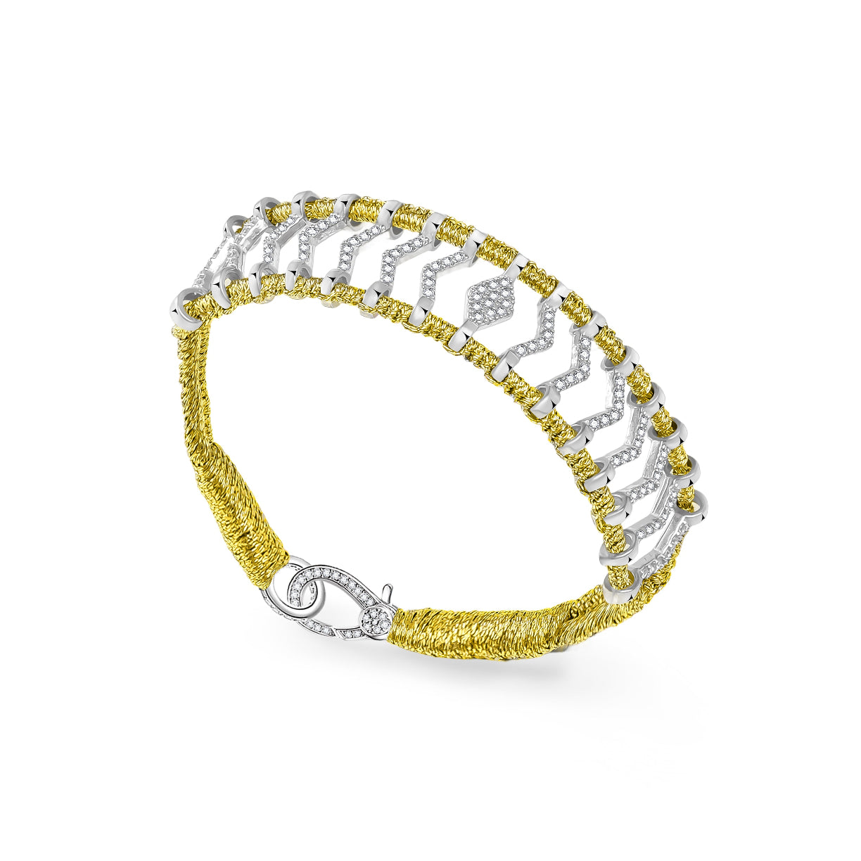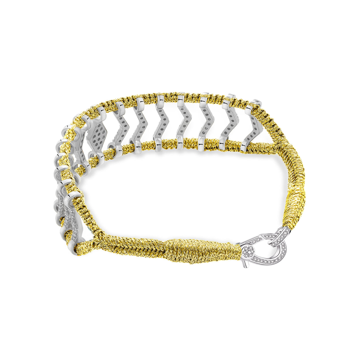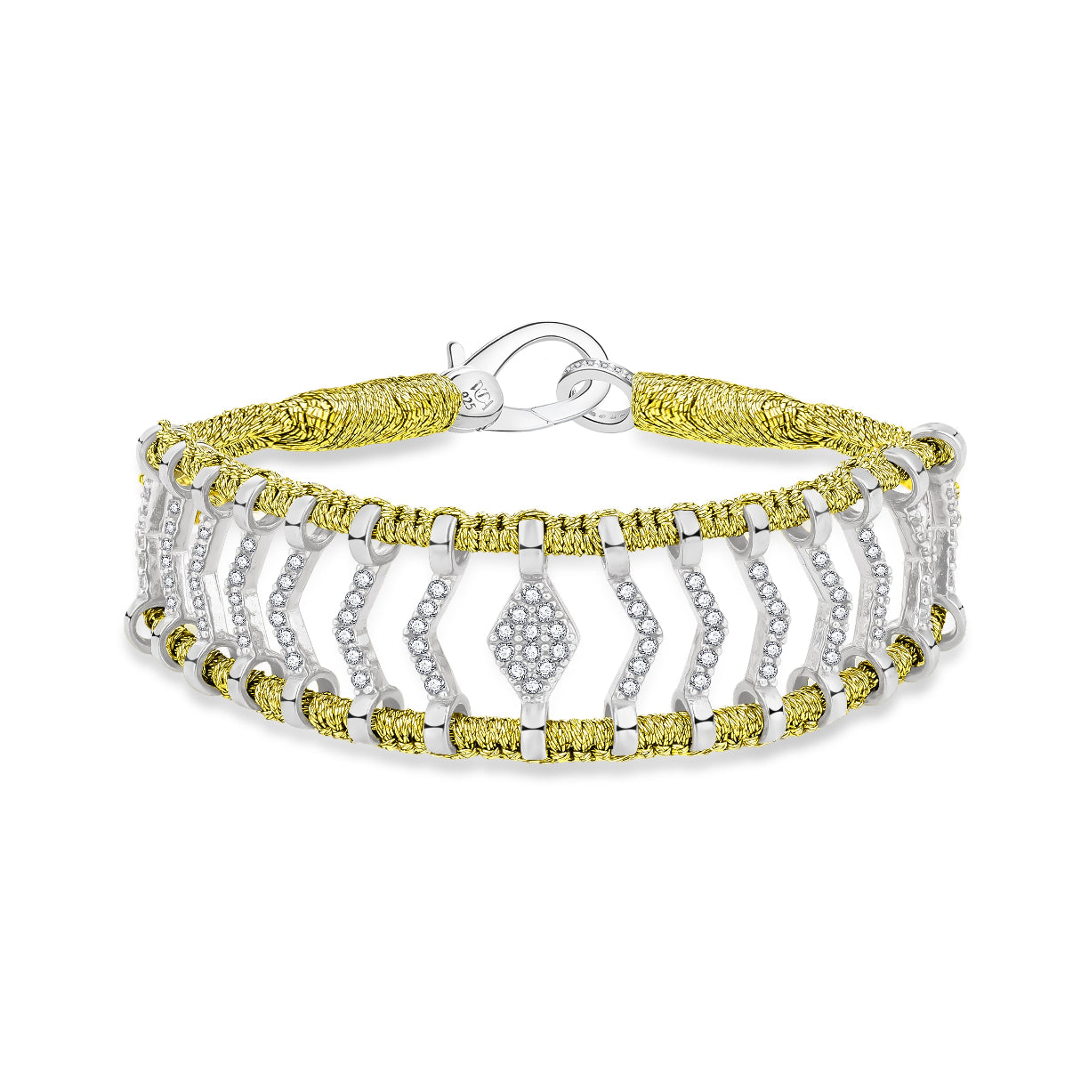 Bracelet fin en fil de lurex tressé de couleur gold, décoré d’un motif en argent 925 et serti de moissanites.