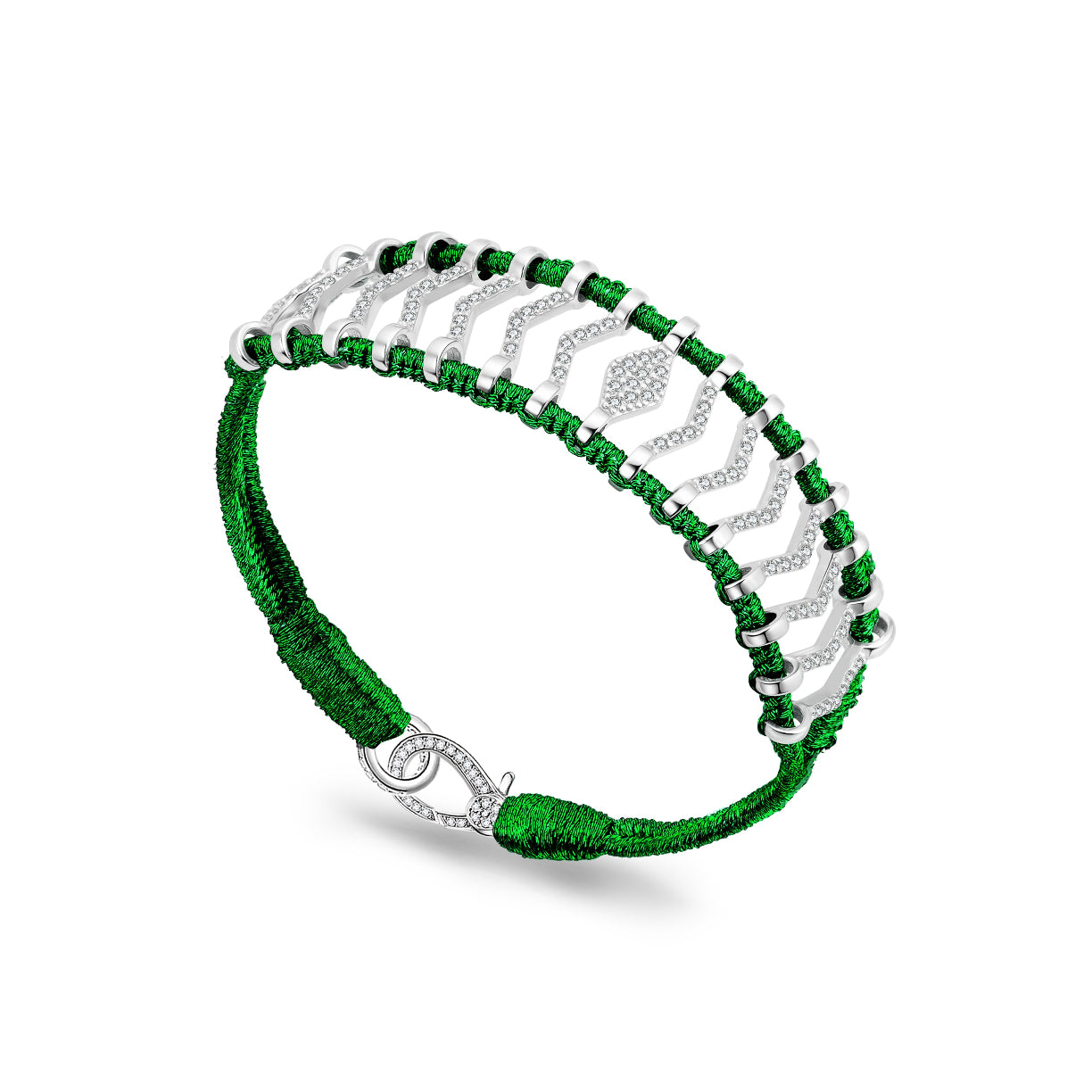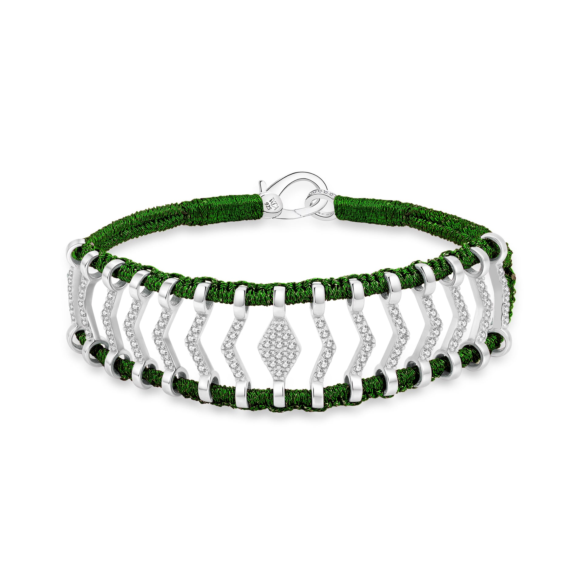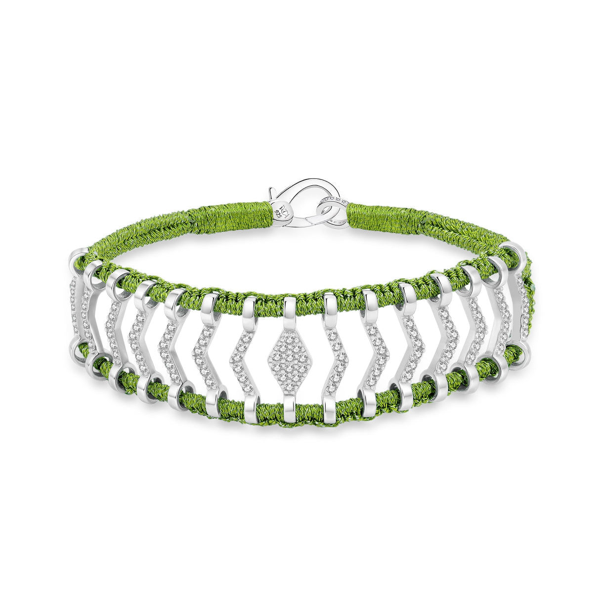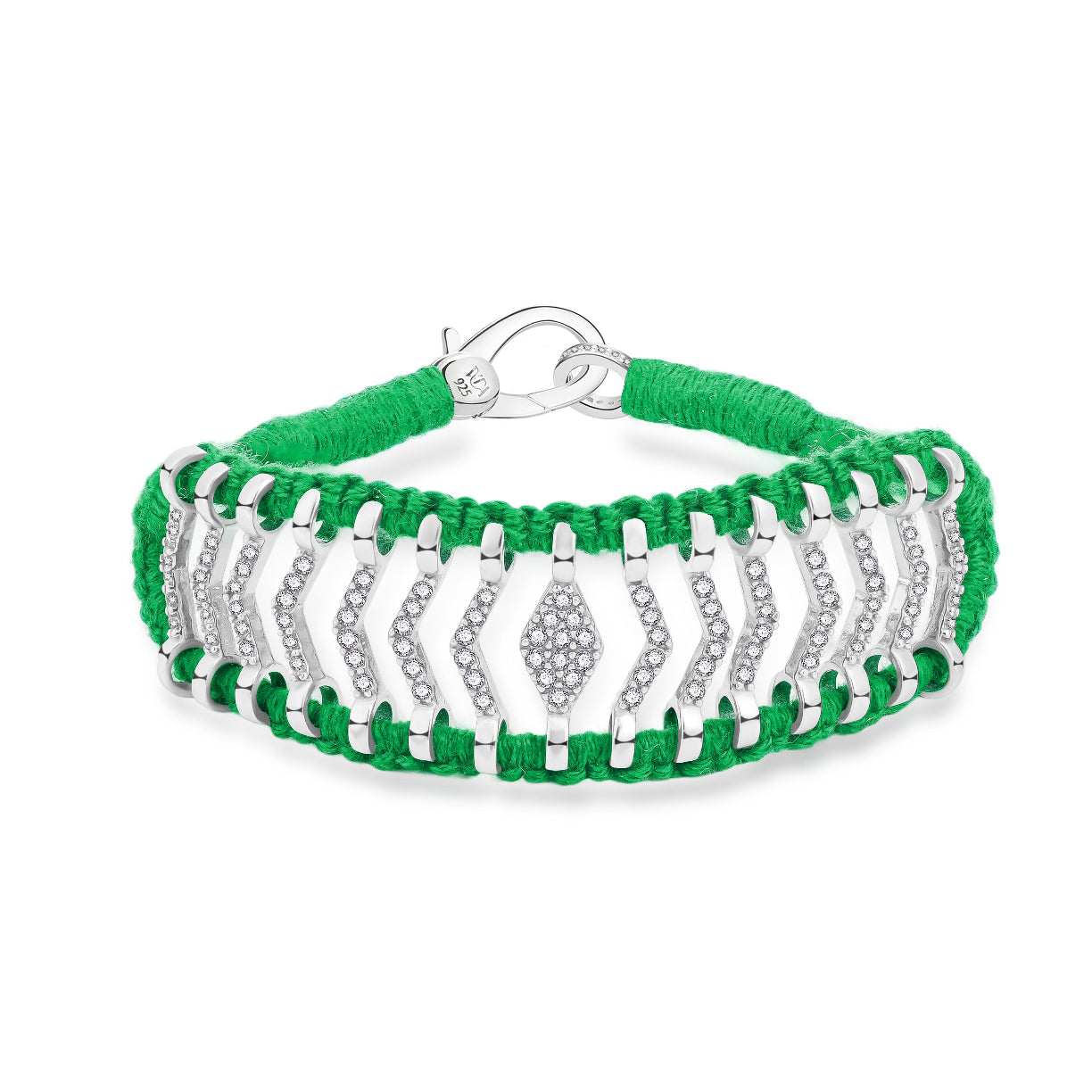 Bracelet fin en fil de lurex tressé de couleur grass, décoré d’un motif en argent 925 et serti de moissanites.