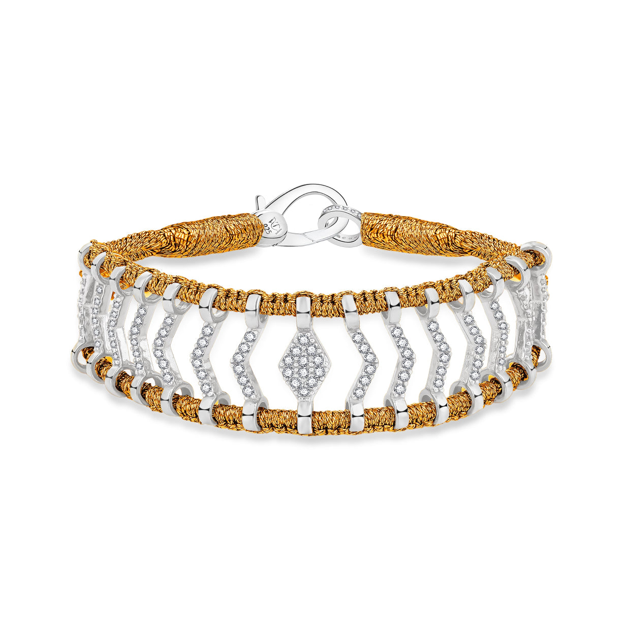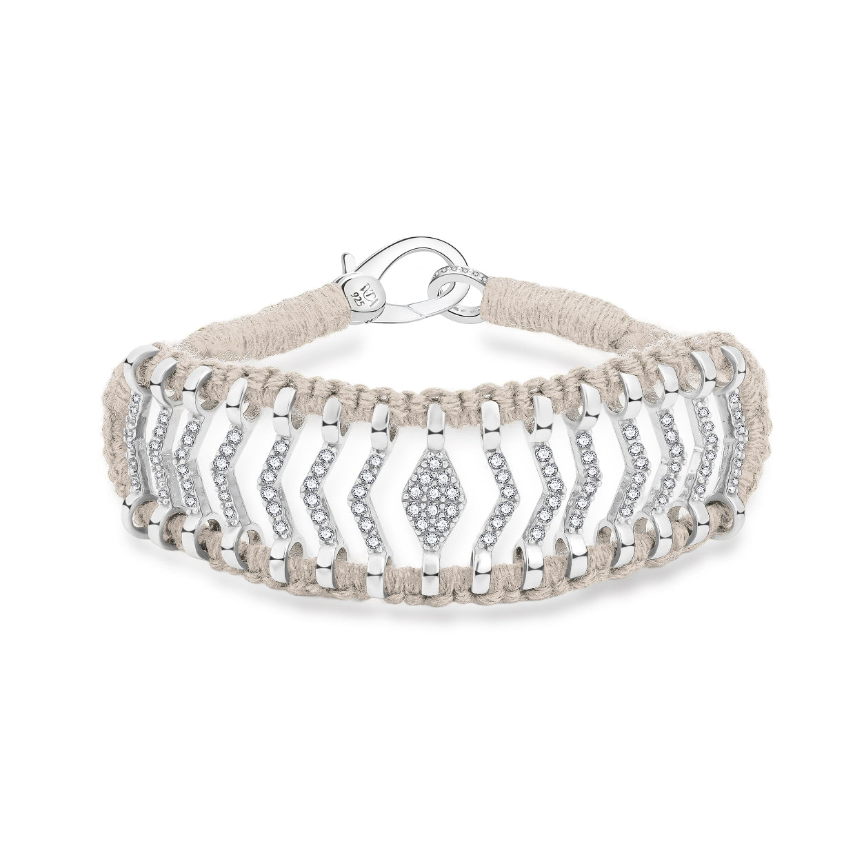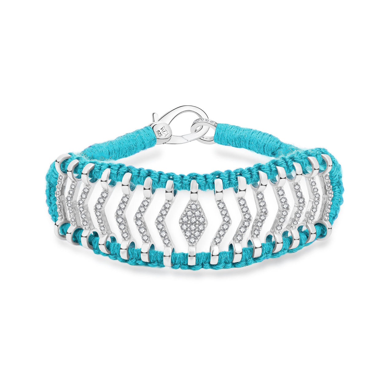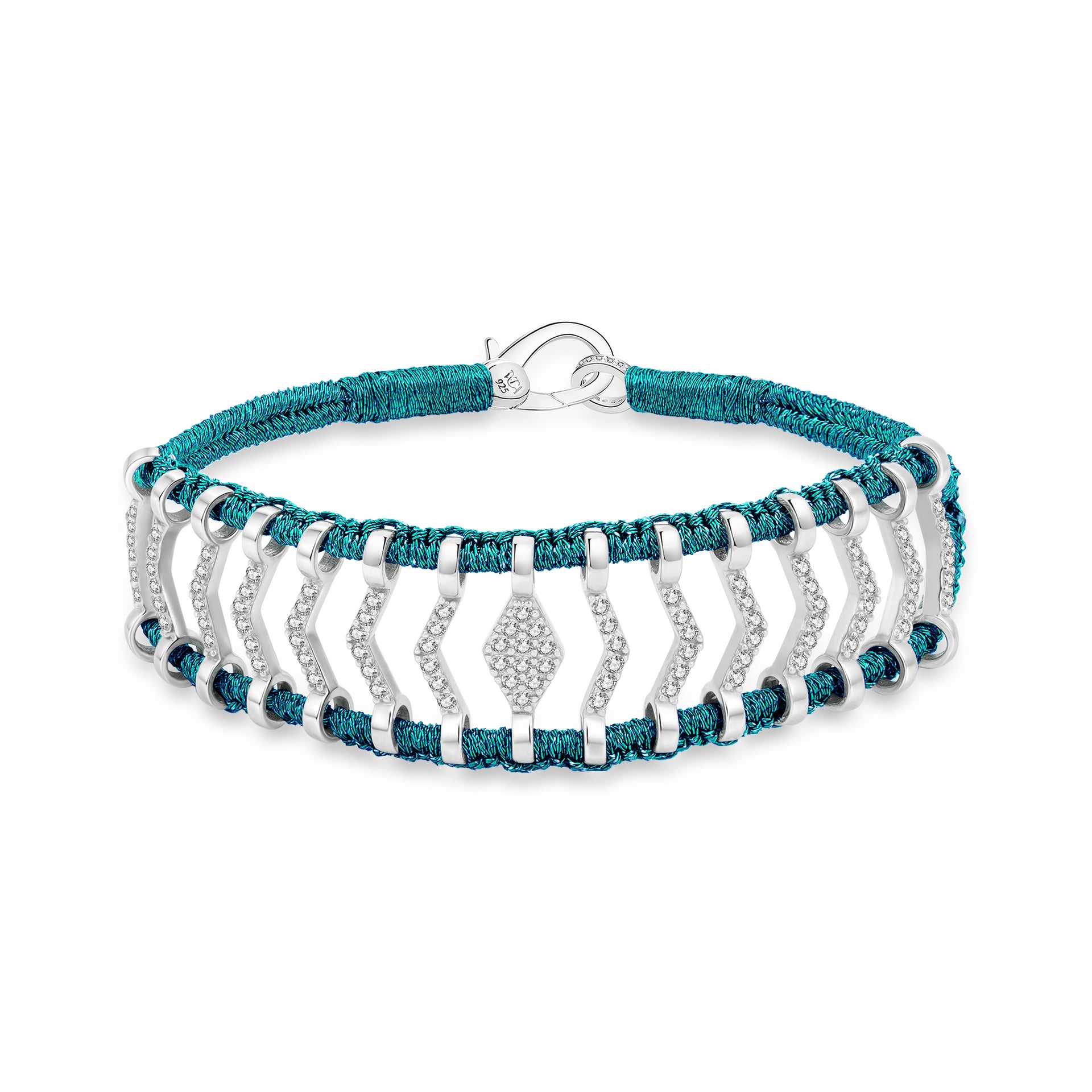 Bracelet fin en fil de lurex tressé de couleur grass, décoré d’un motif en argent 925 et serti de moissanites.