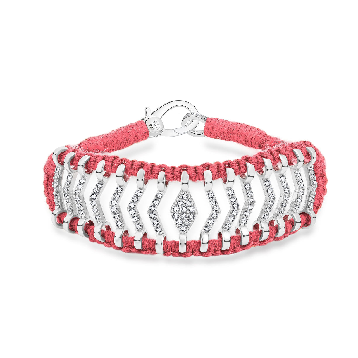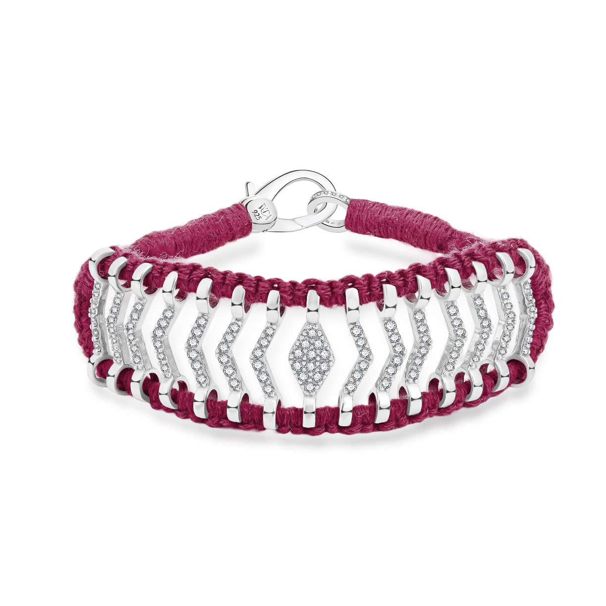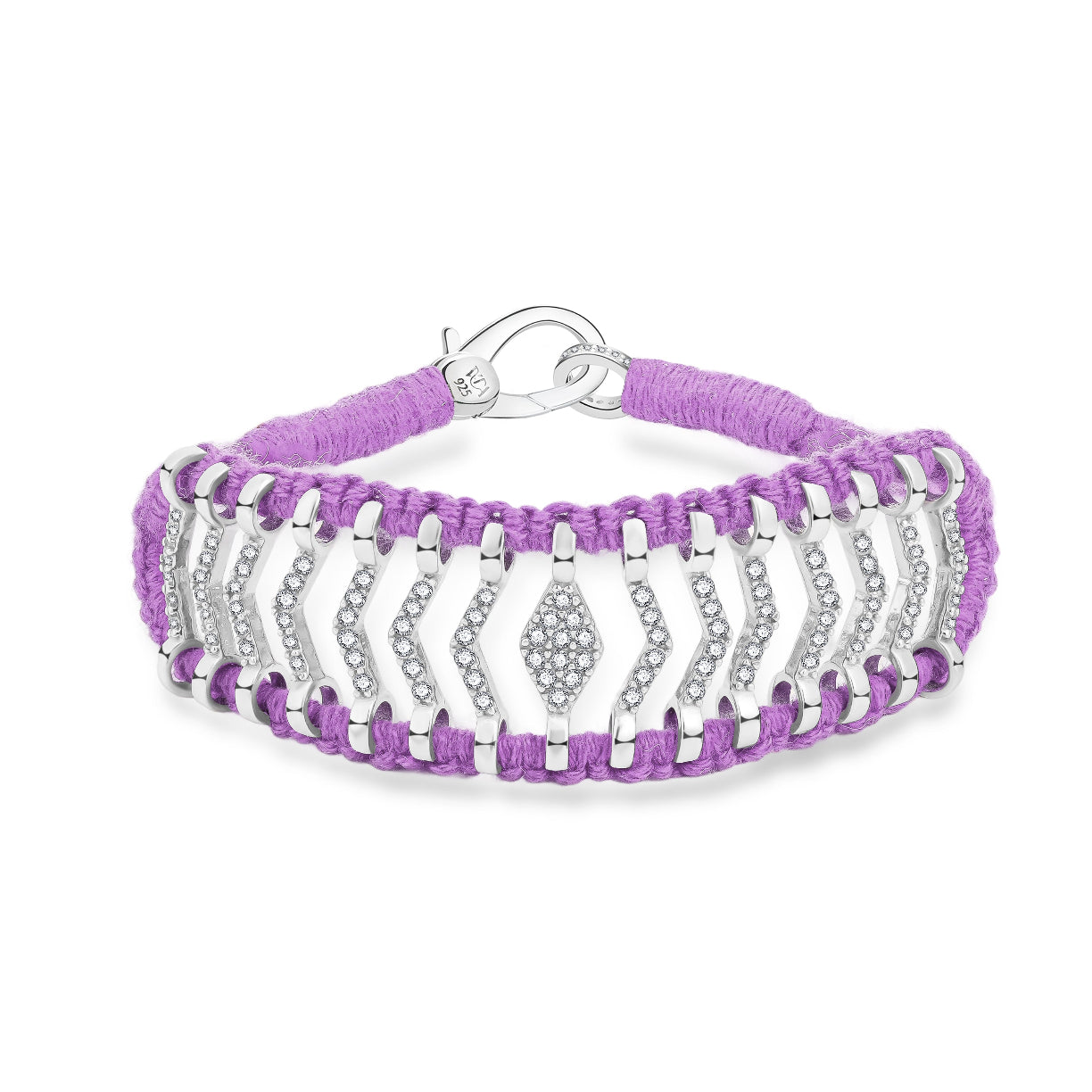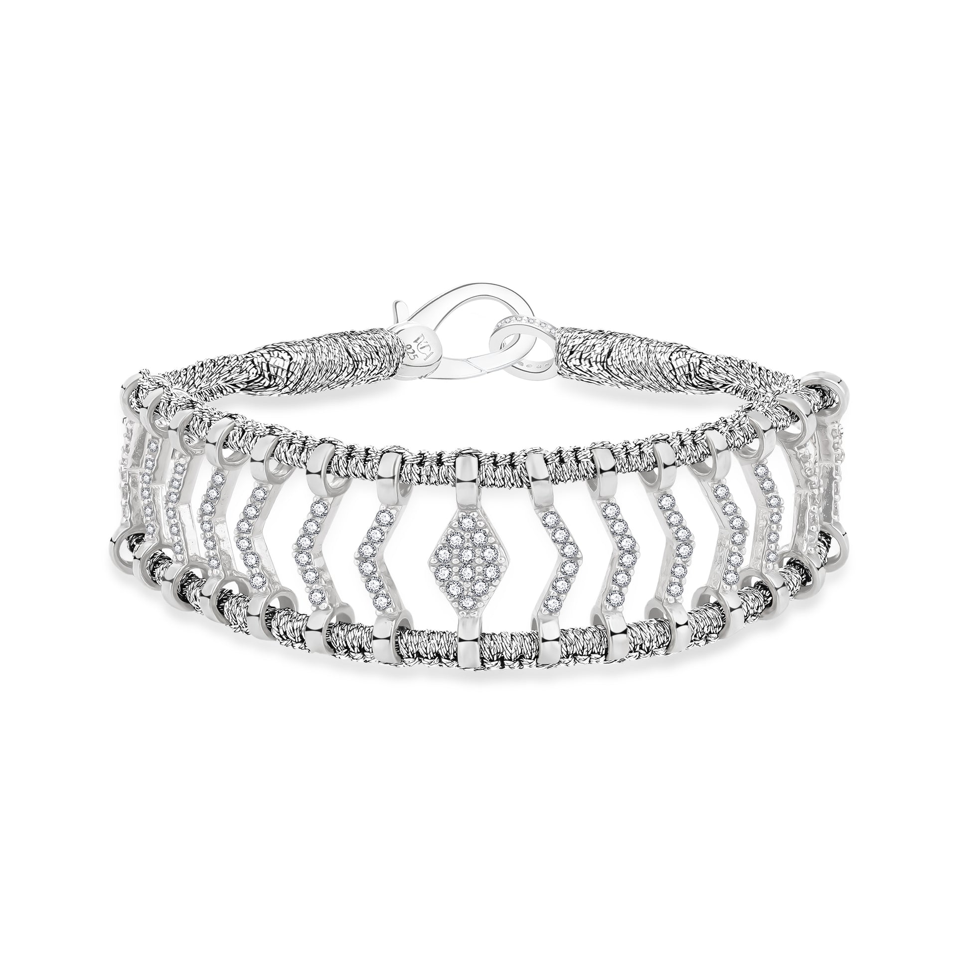 Bracelet fin en fil de lurex tressé de couleur grass, décoré d’un motif en argent 925 et serti de moissanites.