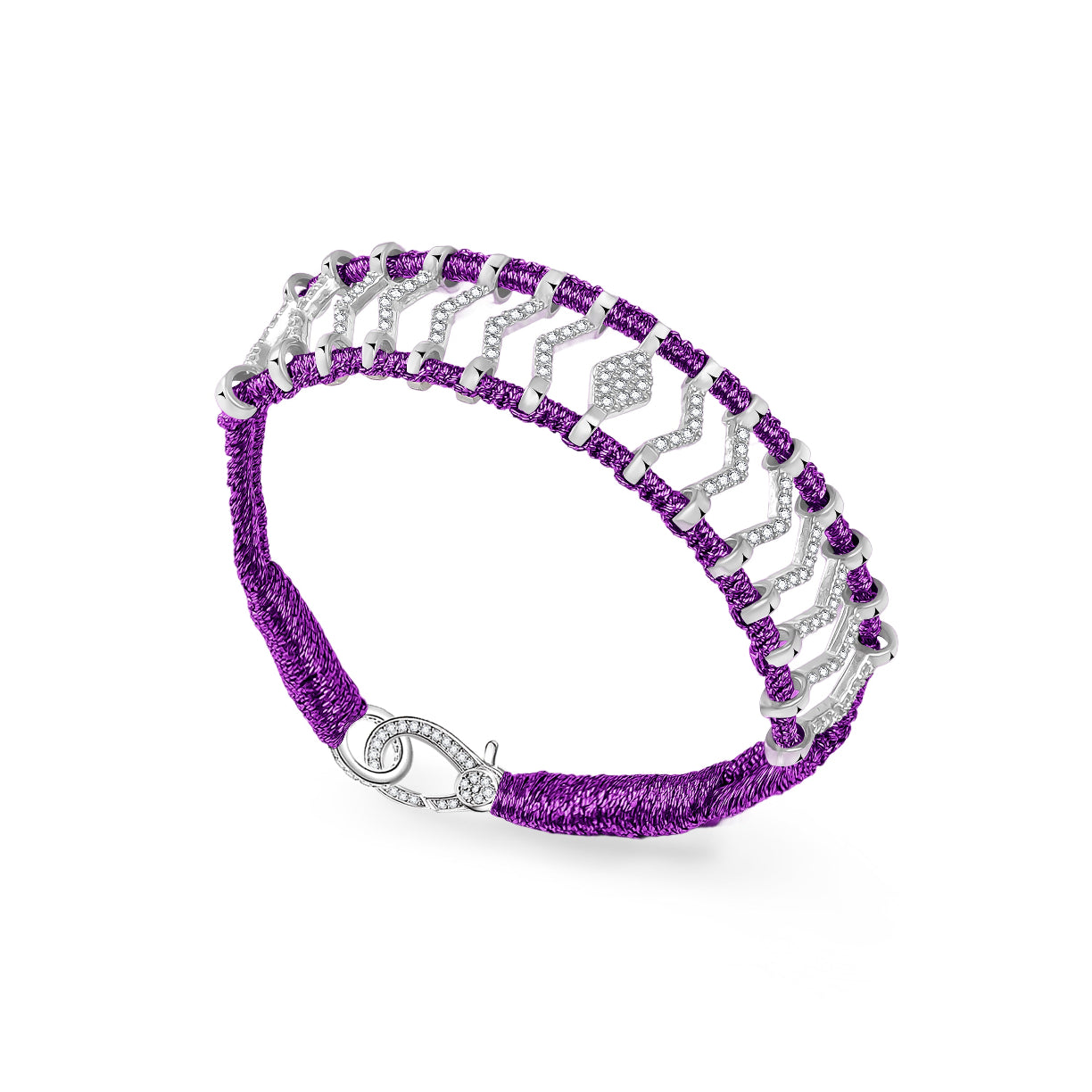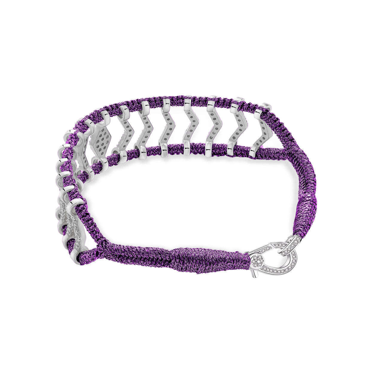 Bracelet fin en fil de lurex tressé de couleur iris, décoré d’un motif en argent 925 et serti de moissanites.