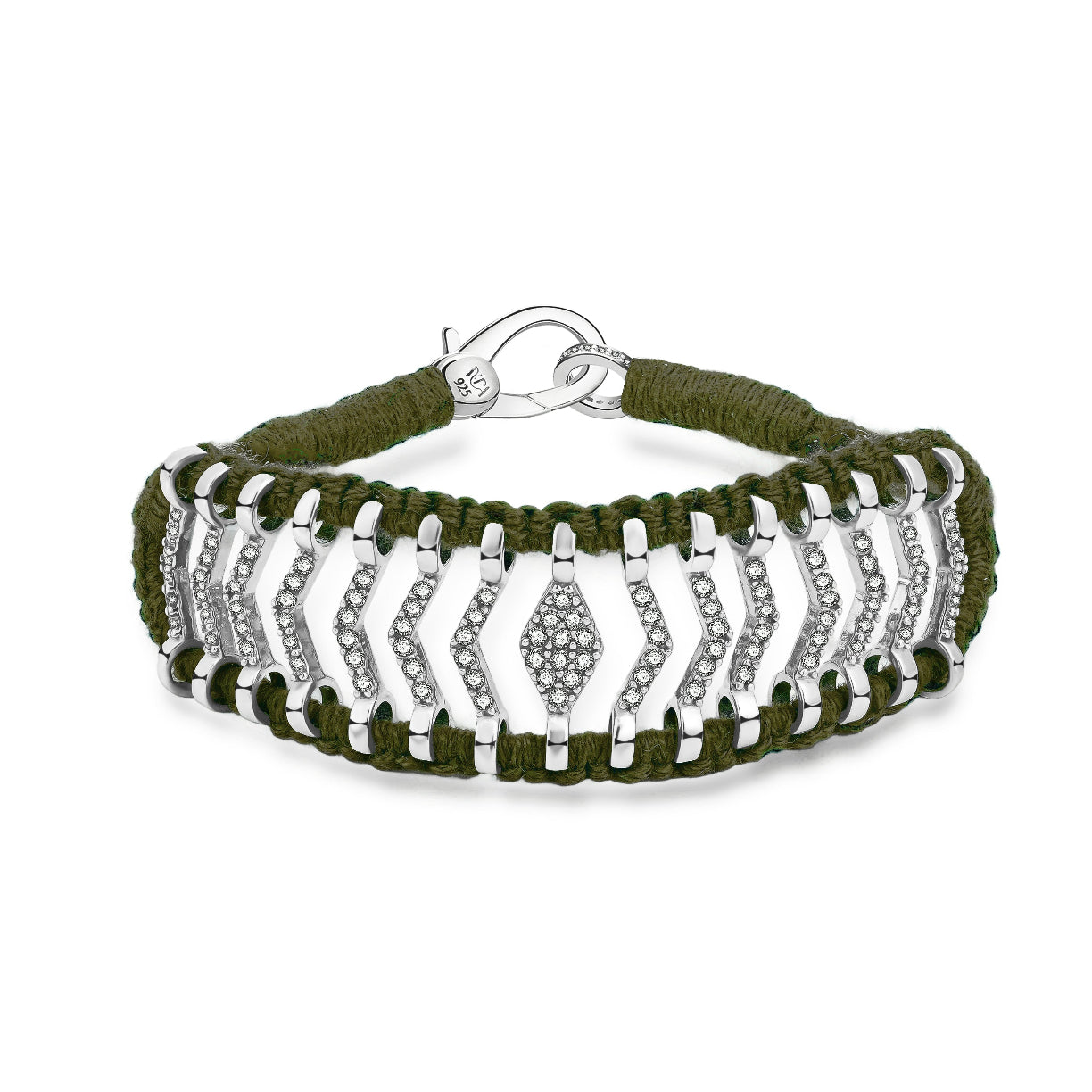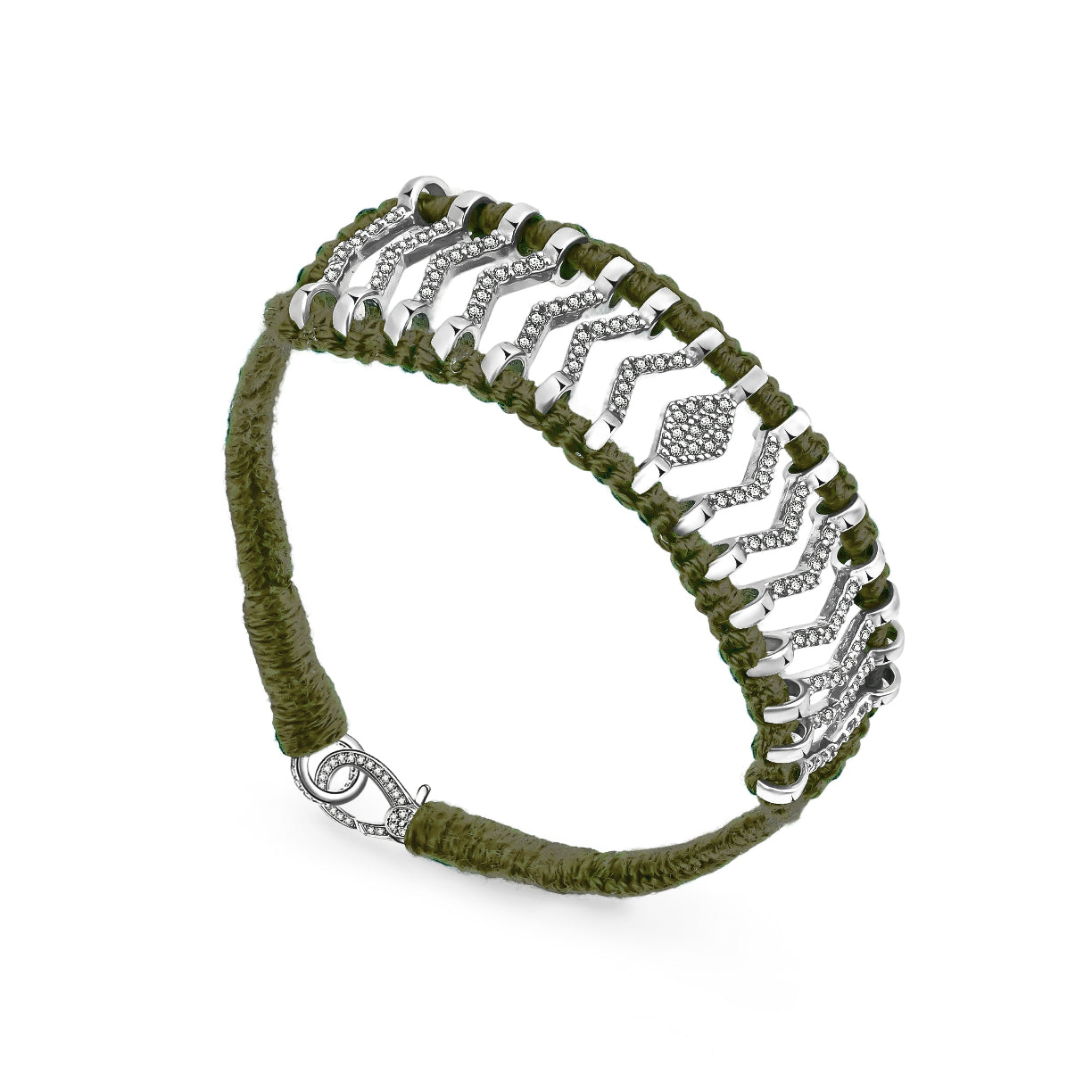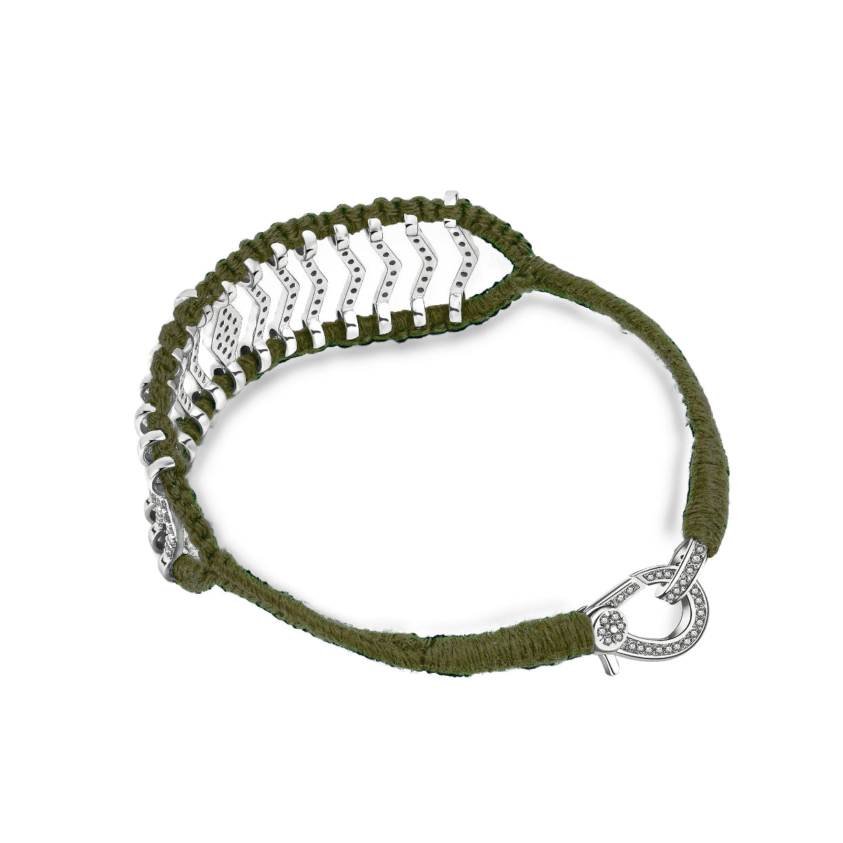 Bracelet fin en fil de coton tressé de couleur kaki, décoré d’un motif en argent 925 et serti de moissanites.