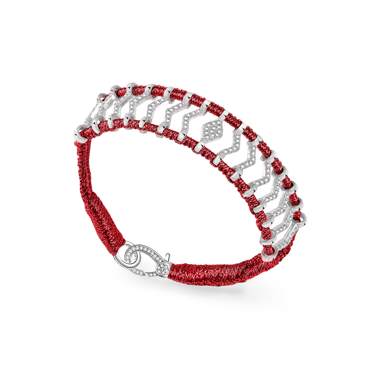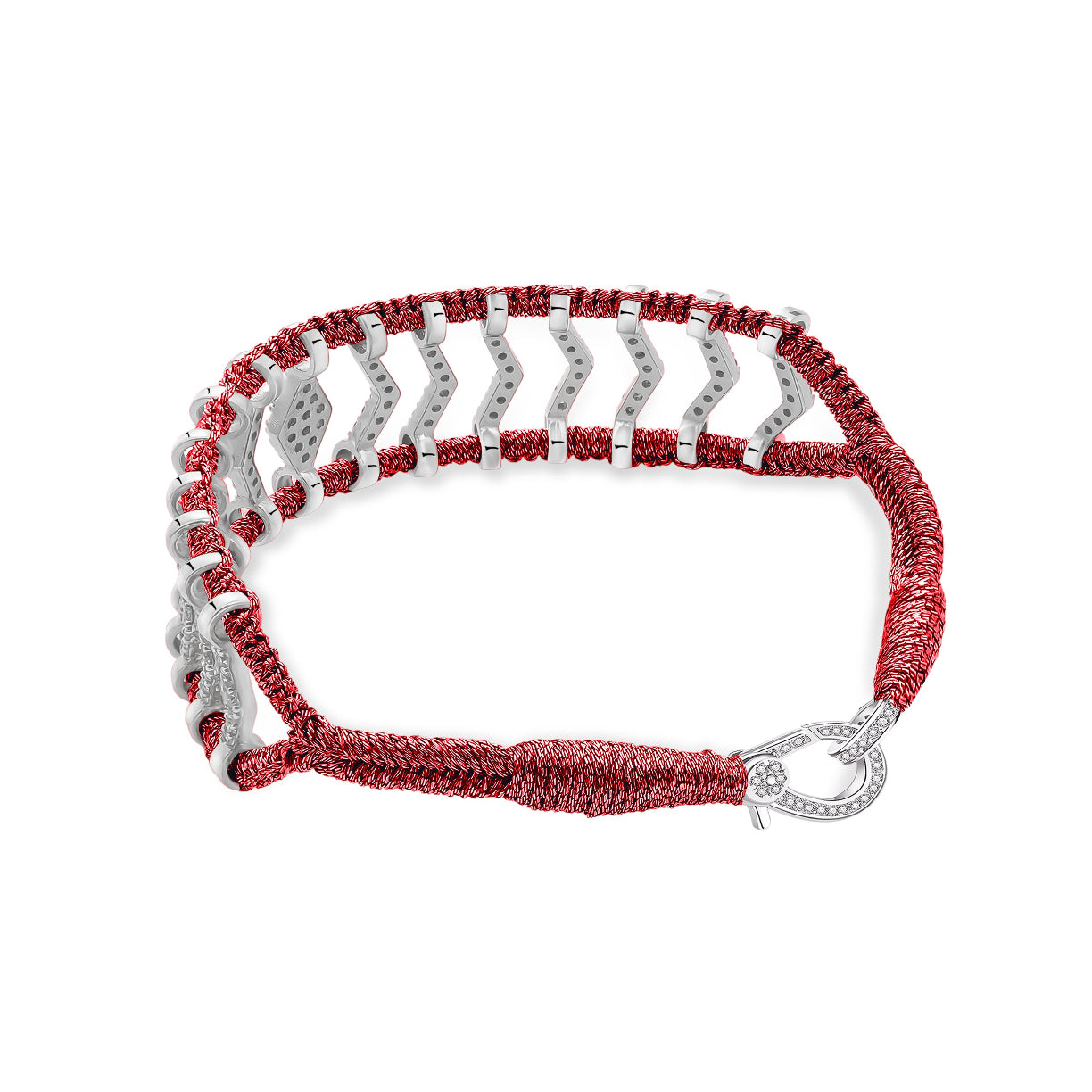 Bracelet fin en fil de lurex tressé de couleur lipstick, décoré d’un motif en argent 925 et serti de moissanites.