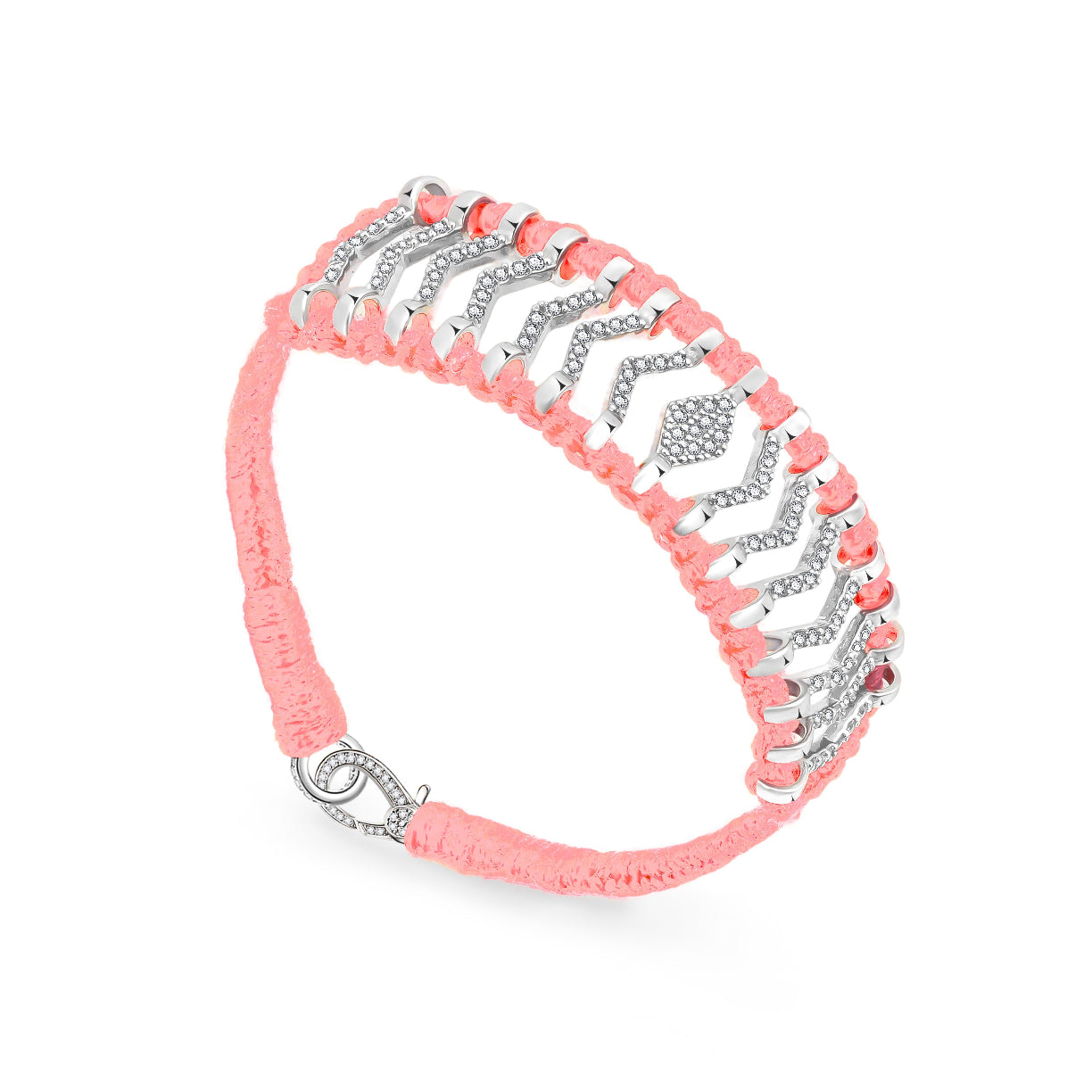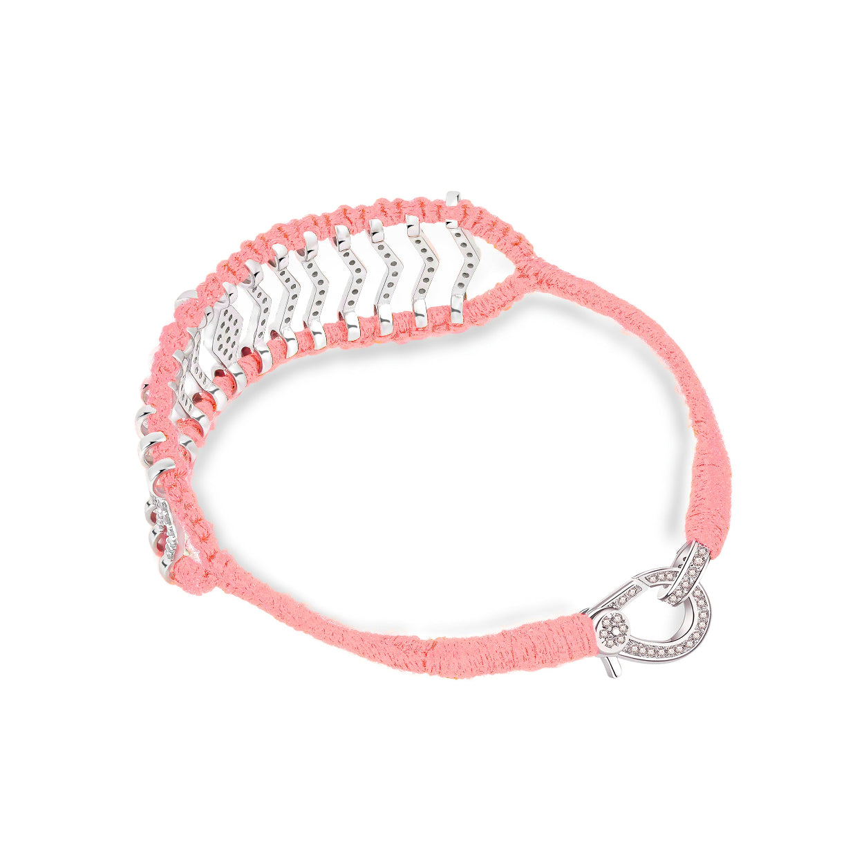 Bracelet fin en fil de coton tressé de couleur neon coral, décoré d’un motif en argent 925 et serti de moissanites.