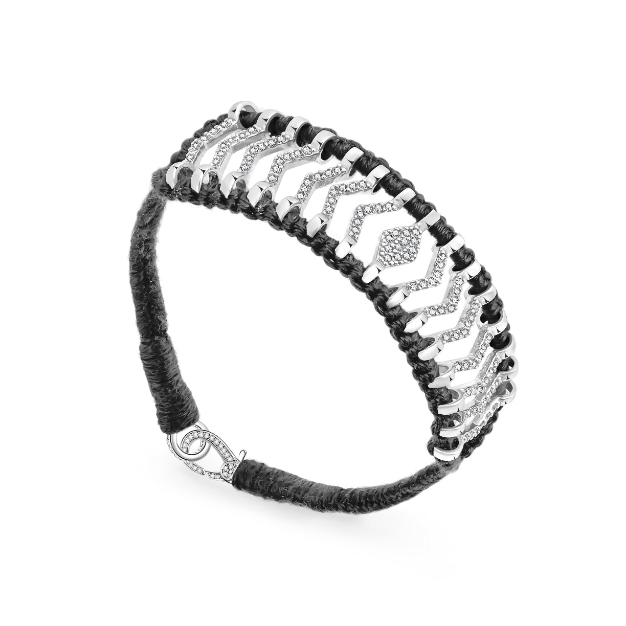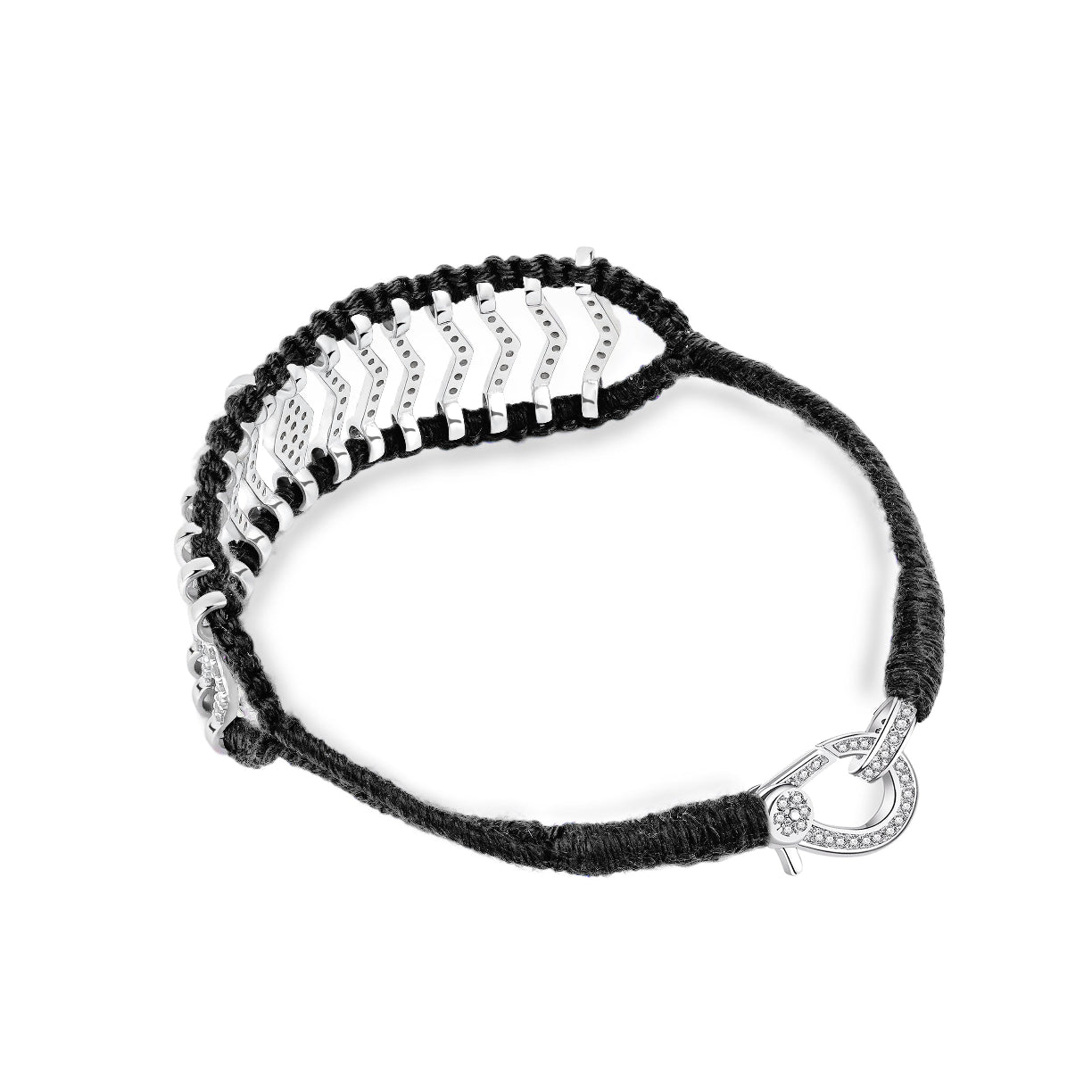 Bracelet fin en fil de coton tressé de couleur noir, décoré d’un motif en argent 925 et serti de moissanites.