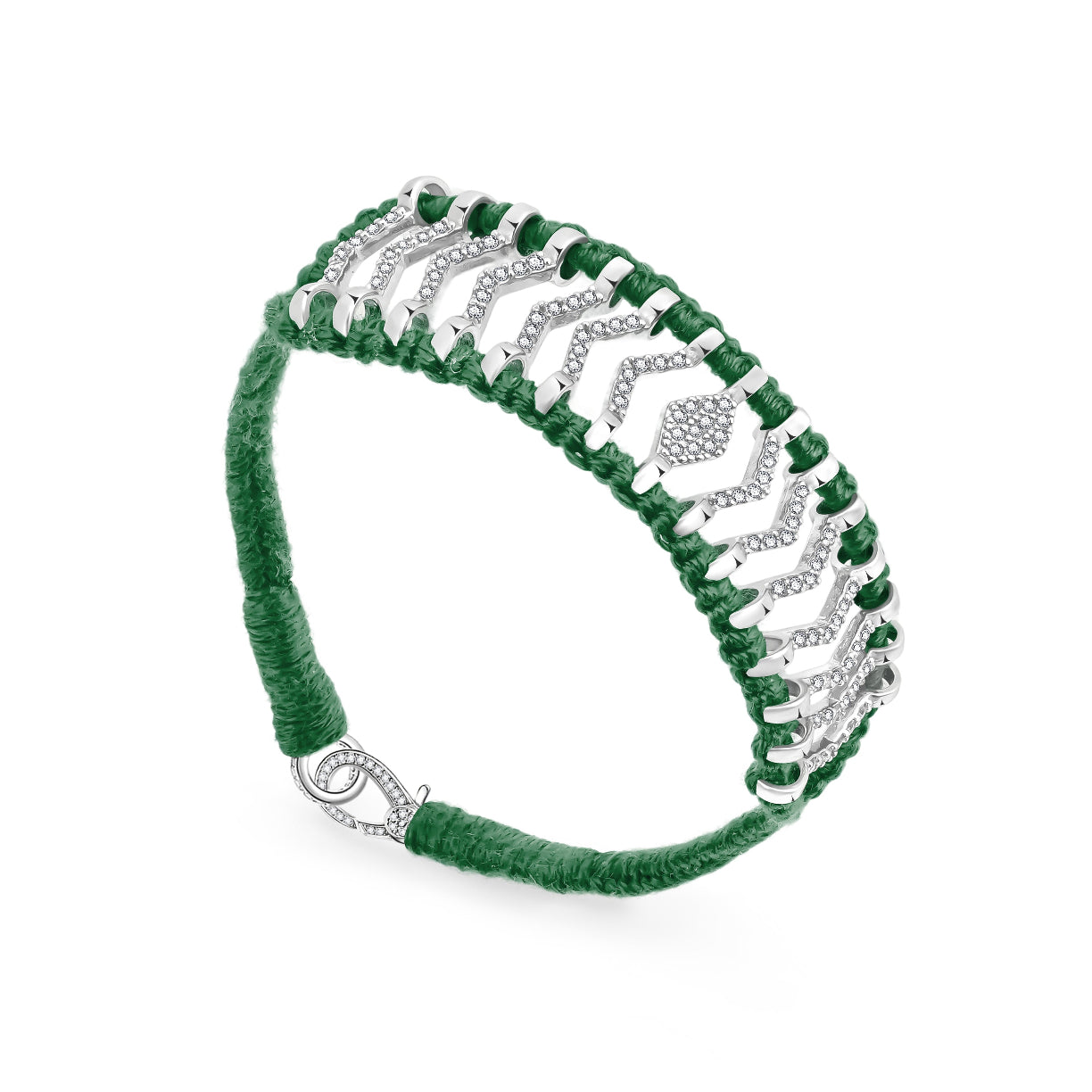 Bracelet fin en fil de coton tressé de couleur sapin, décoré d’un motif en argent 925 et serti de moissanites.