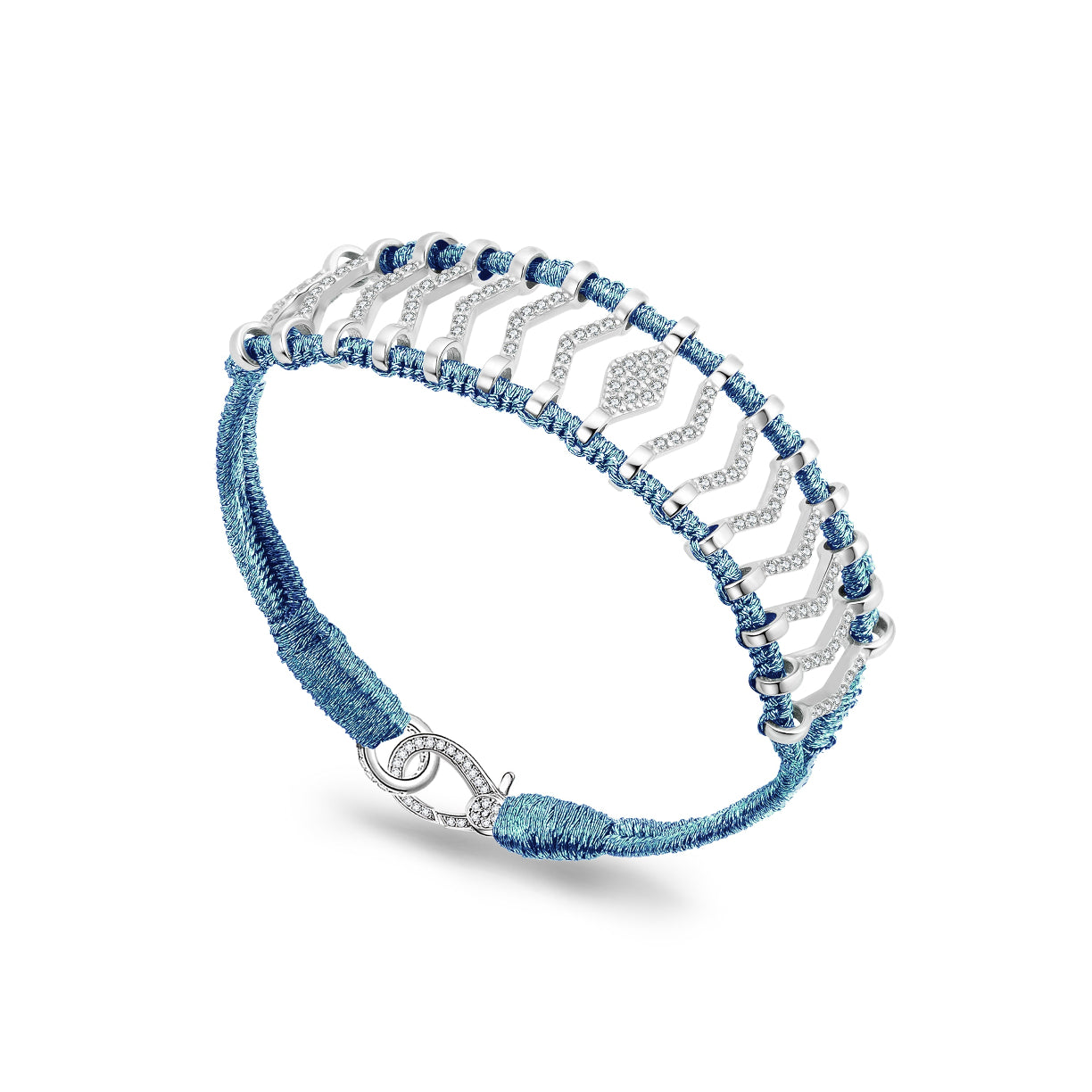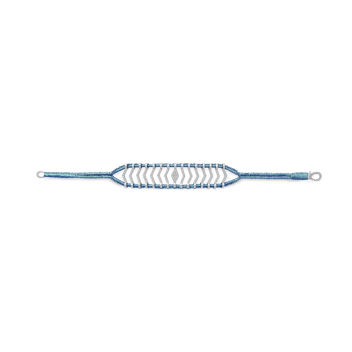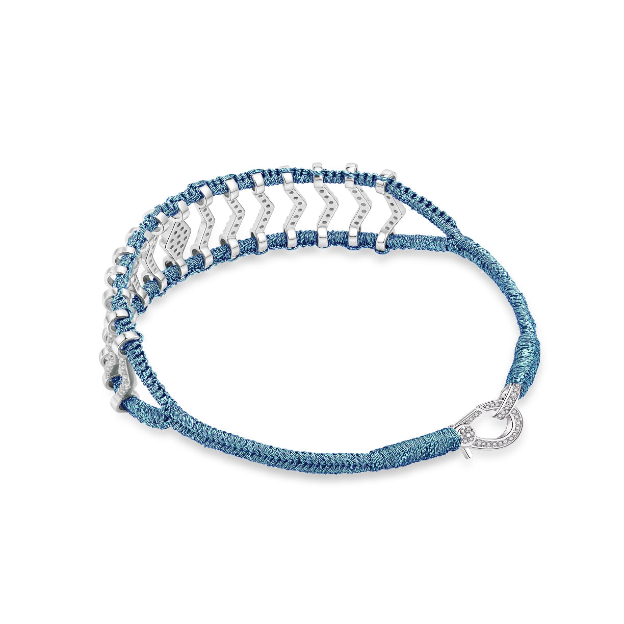 Bracelet fin en fil de lurex tressé de couleur sky, décoré d’un motif en argent 925 et serti de moissanites.