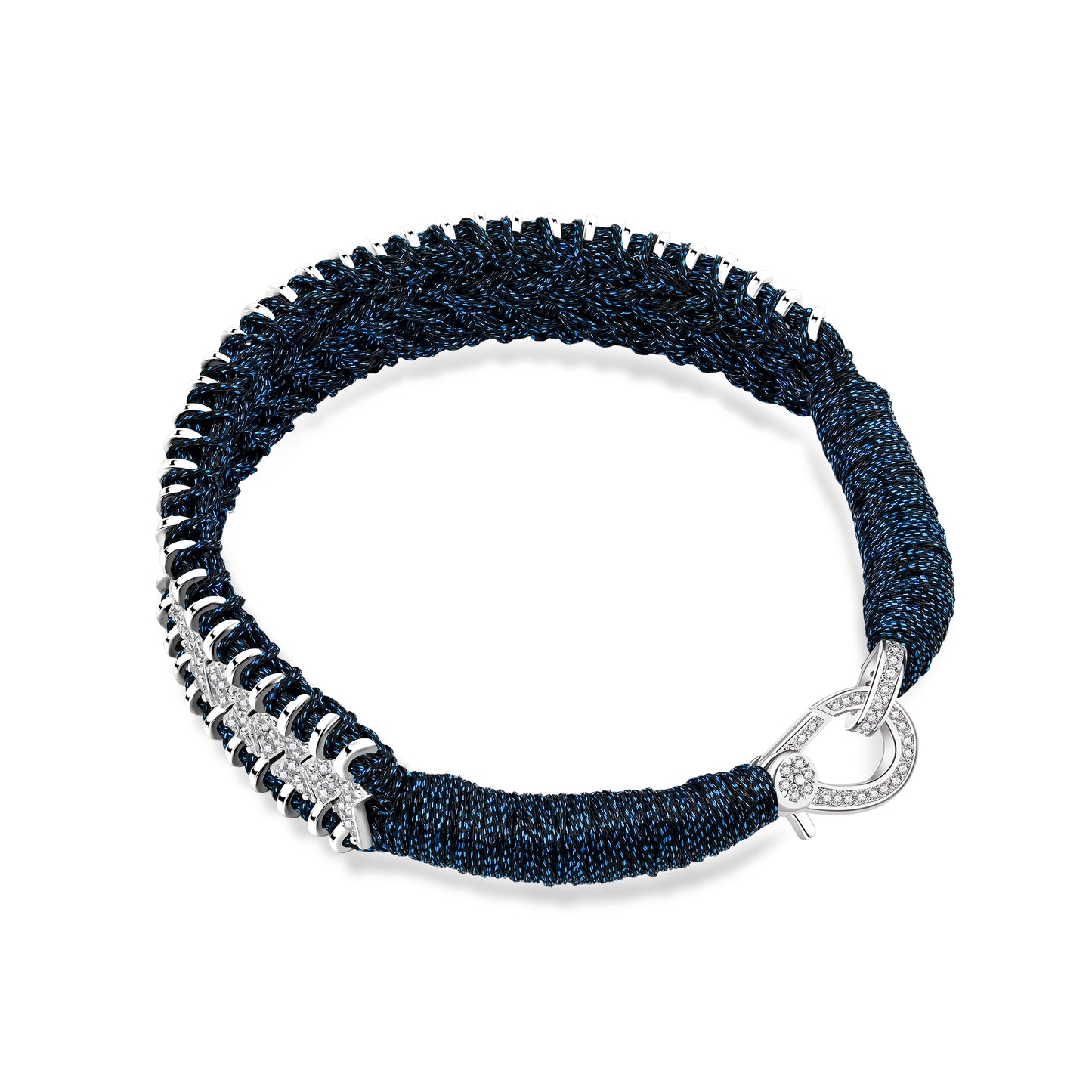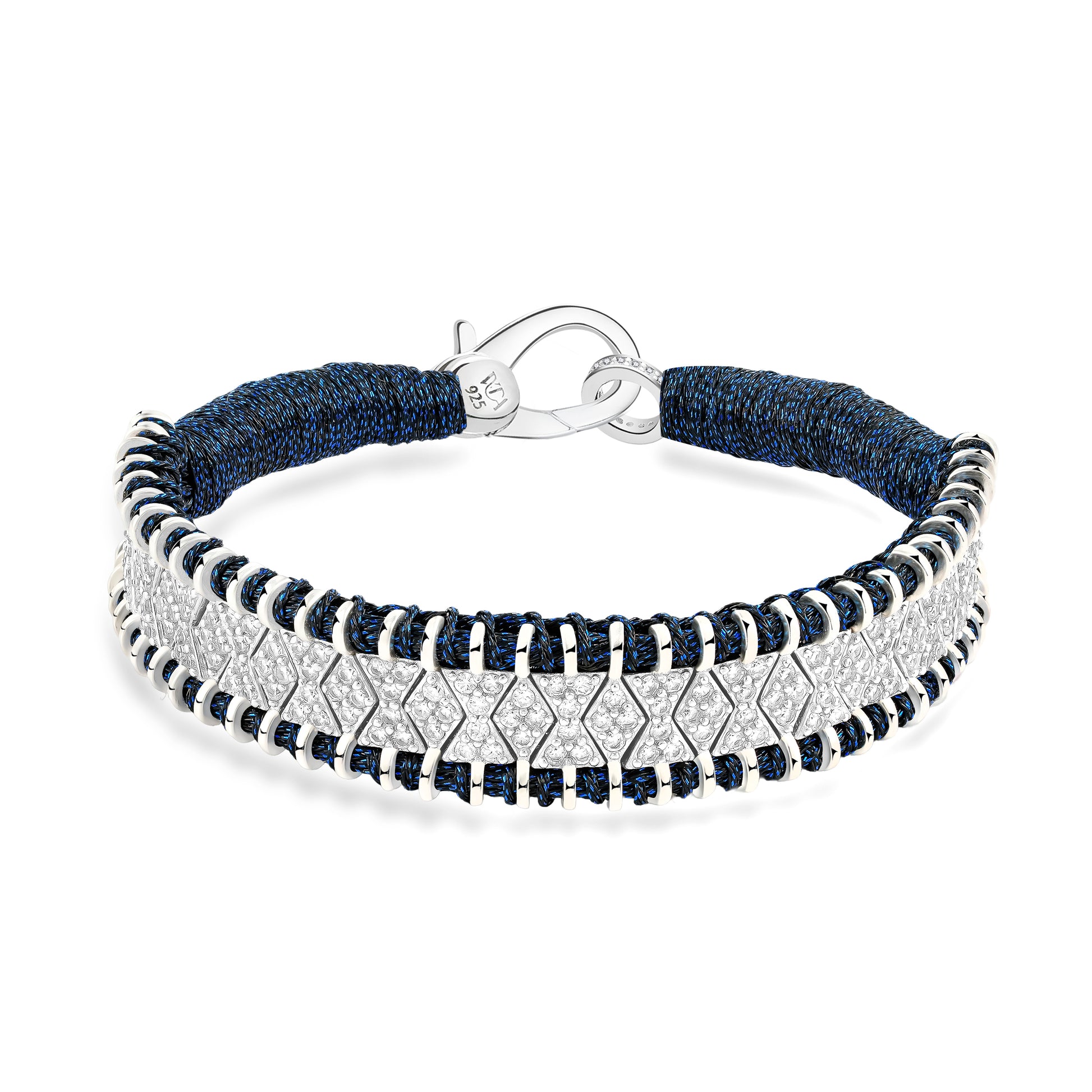 Bracelet en fil de coton tressé de couleur bleu roi, décoré d’un motif en argent 925 et serti d’une multitude de diamants.
