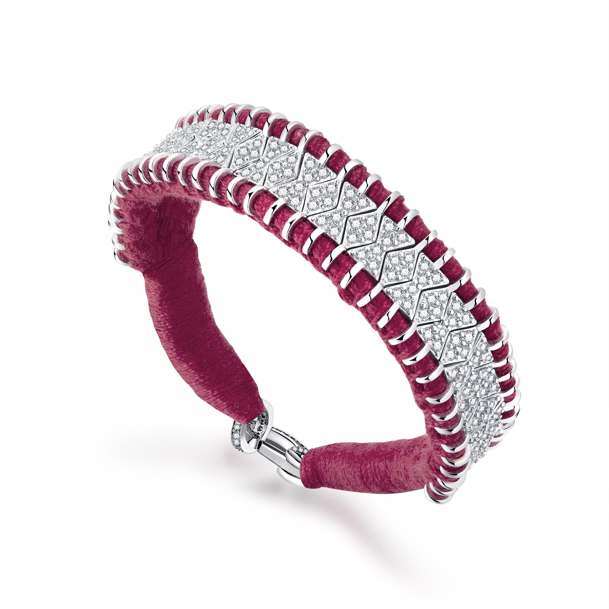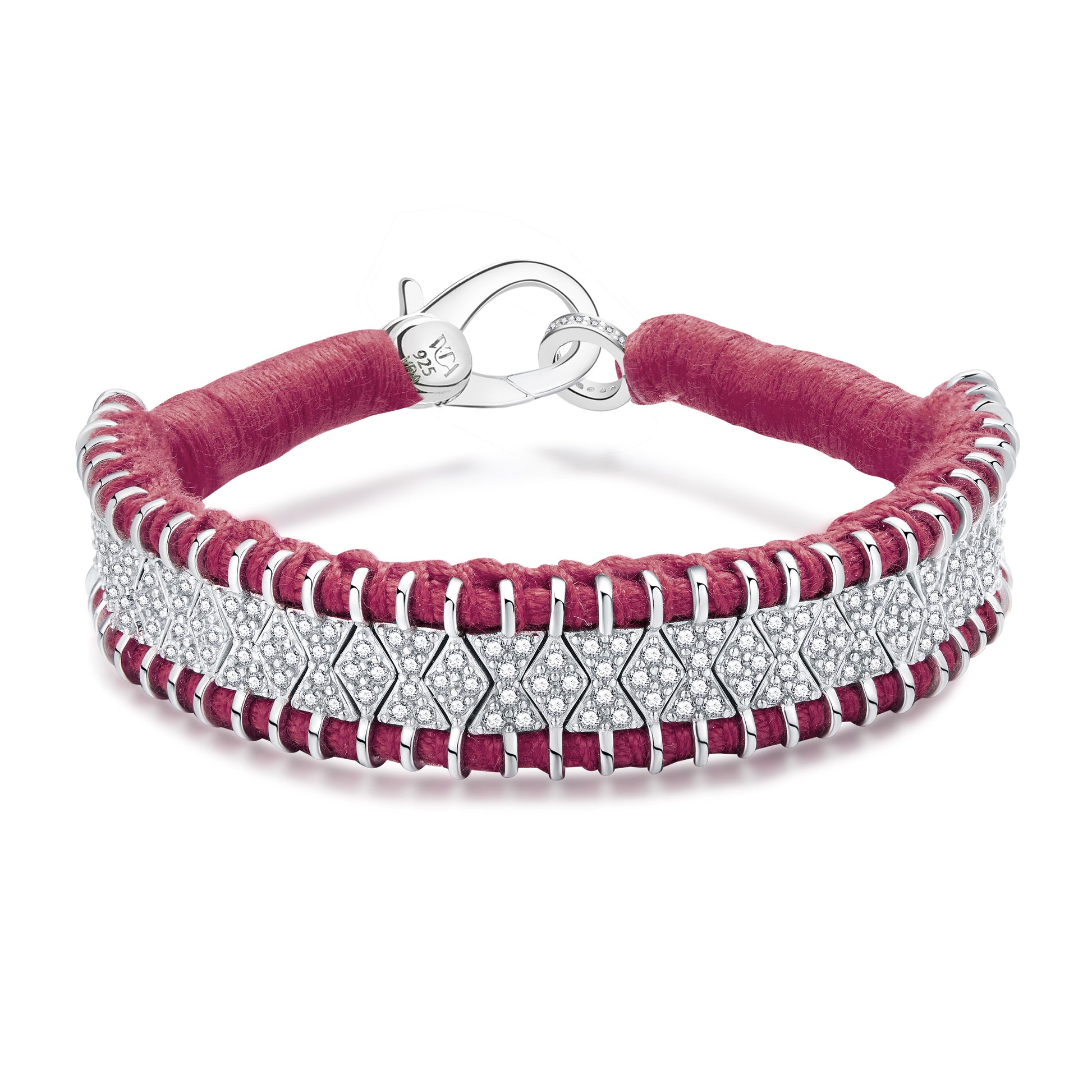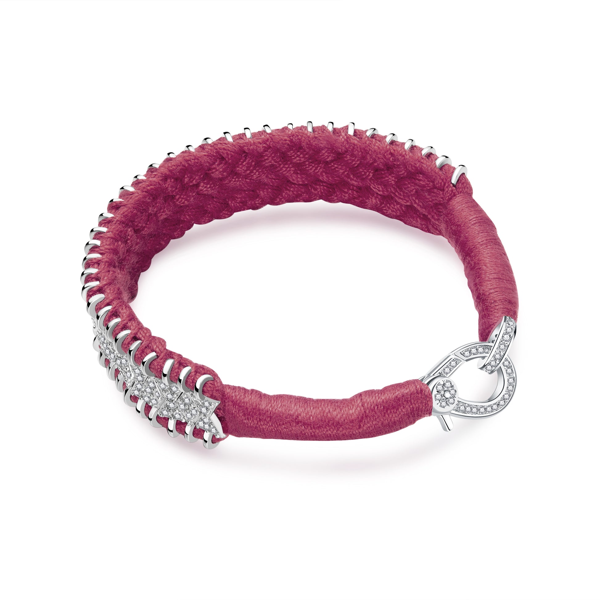 Bracelet en fil de coton tressé de couleur bambou, décoré d’un motif en argent 925 et serti d’une multitude de diamants.