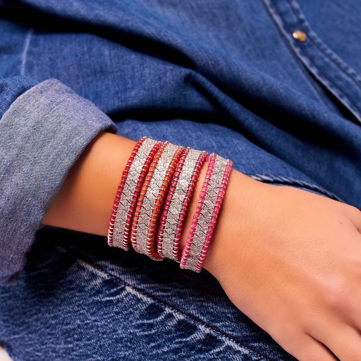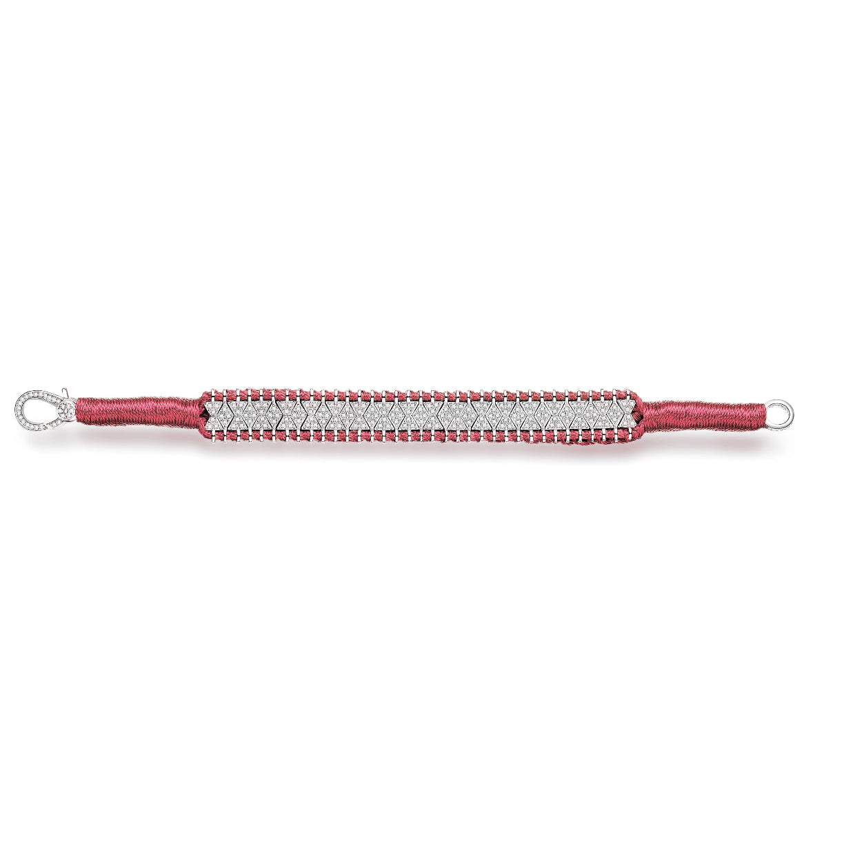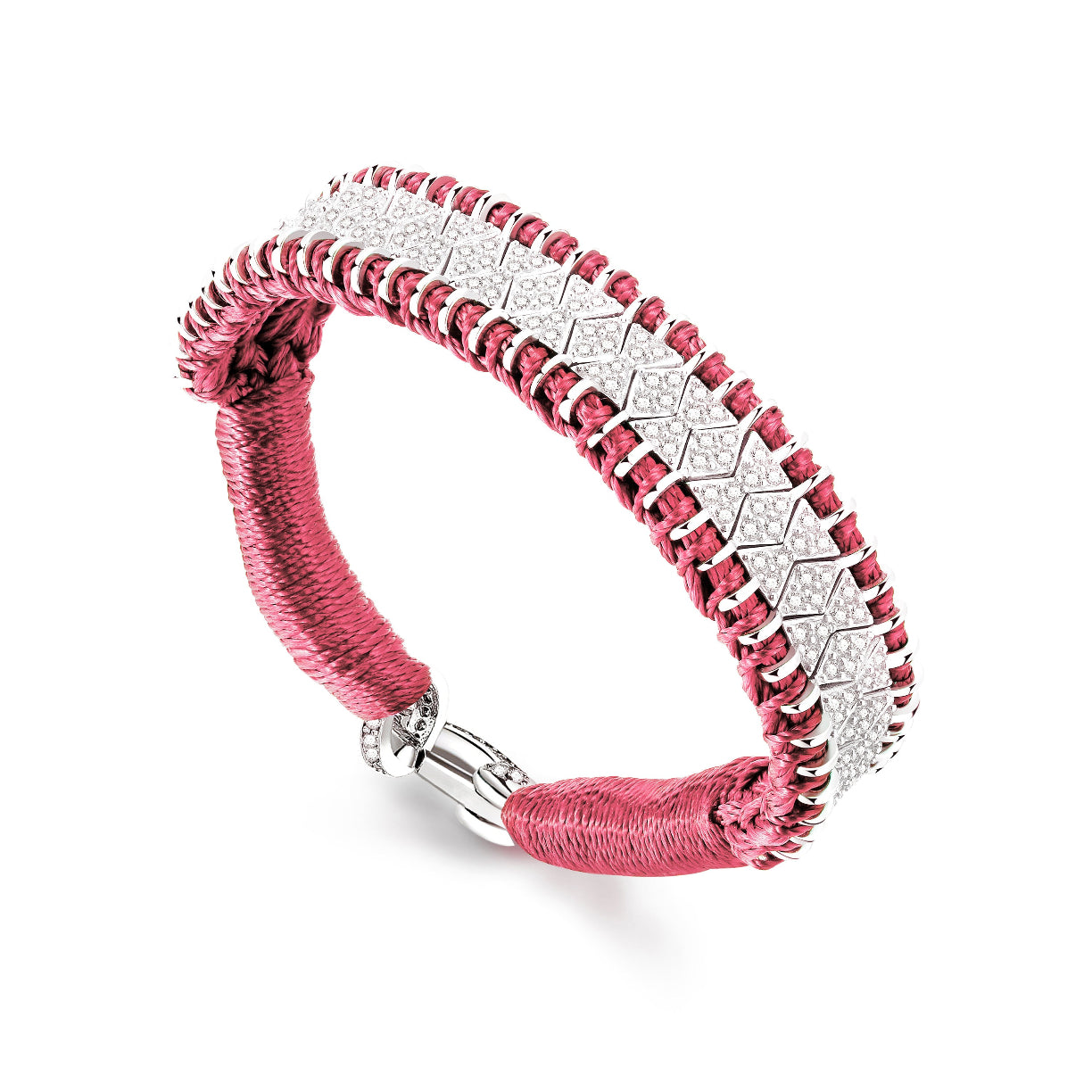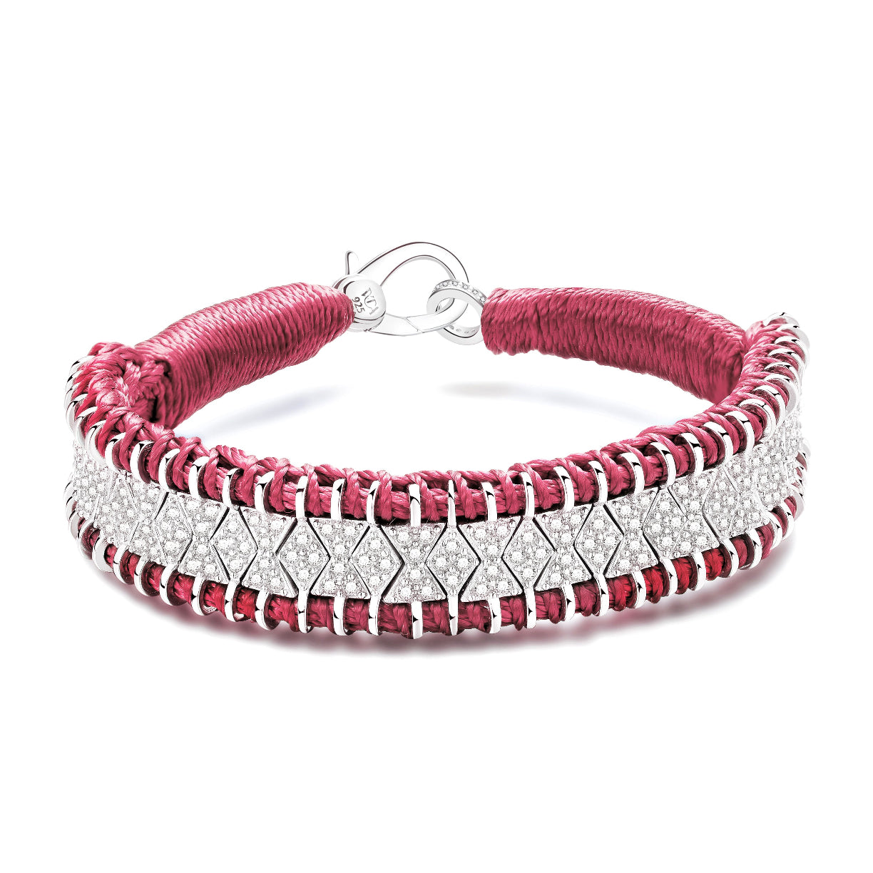 Bracelet en fil de coton tressé de couleur cheeks, décoré d’un motif en argent 925 et serti d’une multitude de diamants.