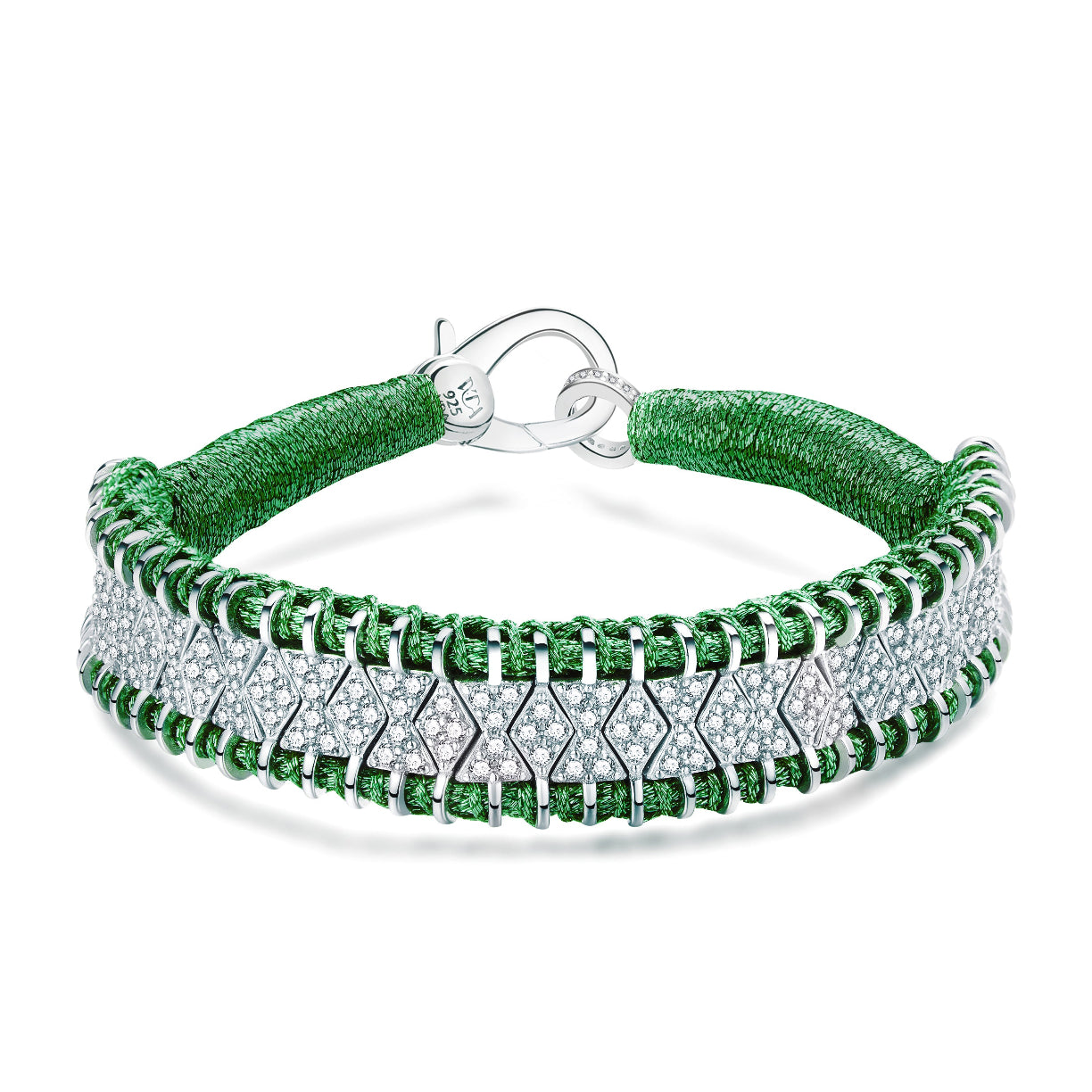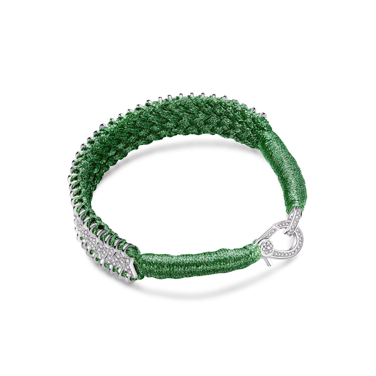 Bracelet en fil de lurex tressé de couleur grass, décoré d’un motif en argent 925 et serti d’une multitude de diamants.