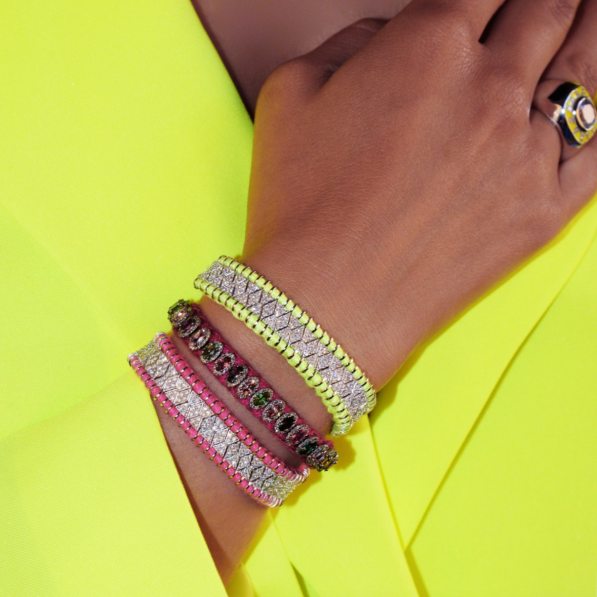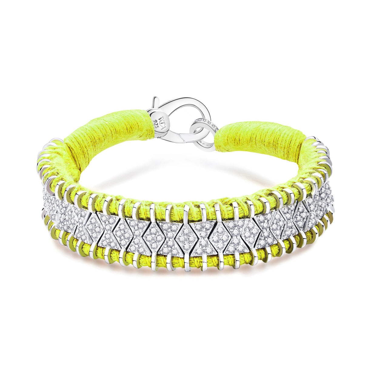 Bracelet en fil de coton tressé de couleur Jaune fluo, décoré d’un motif en argent 925 et serti d’une multitude de diamants.