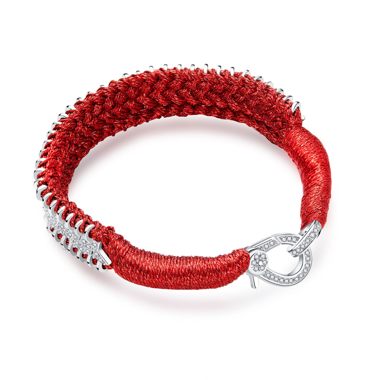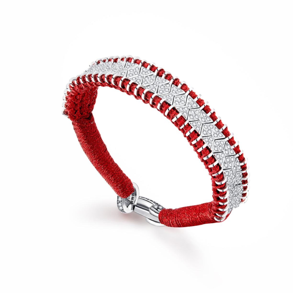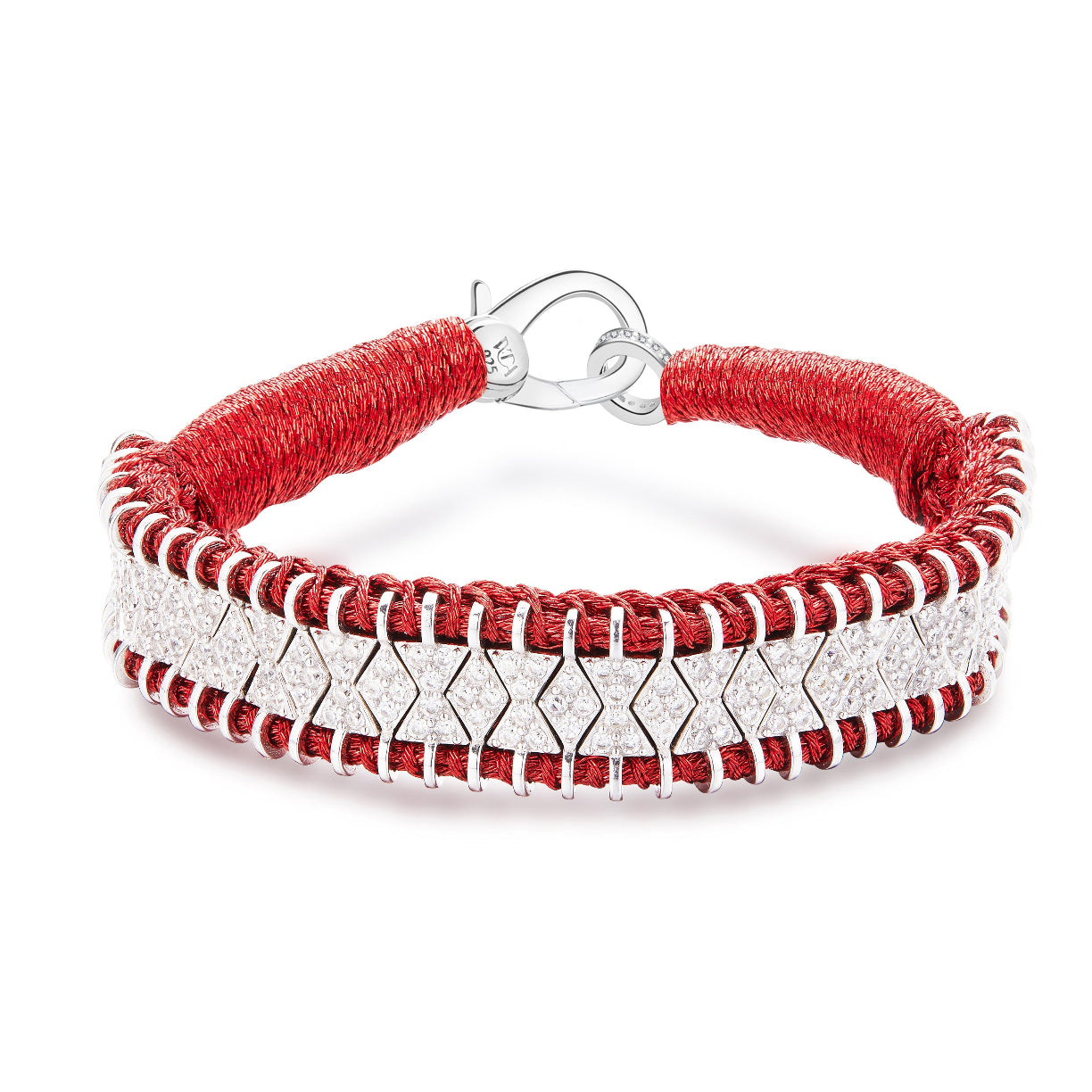 Bracelet en fil de lurex tressé de couleur lipstick, décoré d’un motif en argent 925 et serti d’une multitude de diamants.
