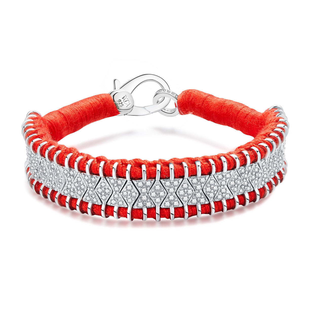 Bracelet en fil de coton tressé de couleur rouge, décoré d’un motif en argent 925 et serti d’une multitude de diamants.